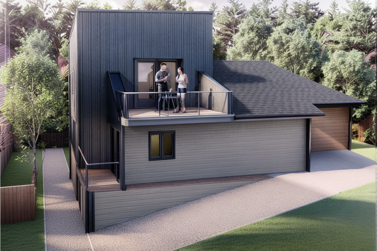 lower horizontal siding change to light gray change vertical siding to dark graychange roof to asphalt shingles remove planter box add lawn on left side remove person sitting add curved walkway left side towards front
