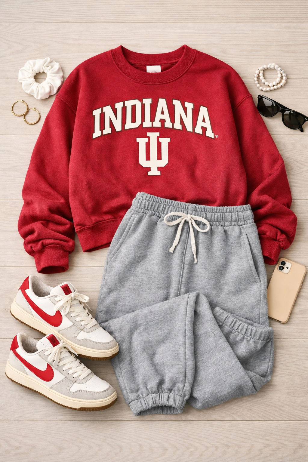 design a living room based on this outfit make a big comfortable deep modern couch in gray with touches on red and gold in accessories and coffee table rug