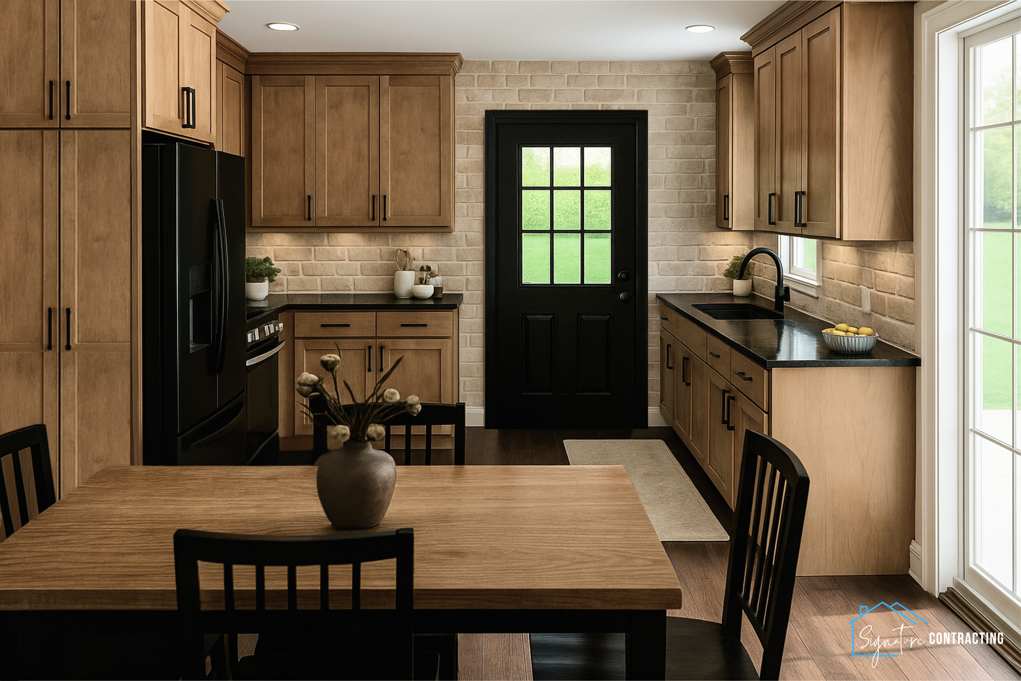 one change only make all of the upper cabinets and the tall cabinet by the fridge a creamy white leave the base cabinets the wood color that they are do not change them