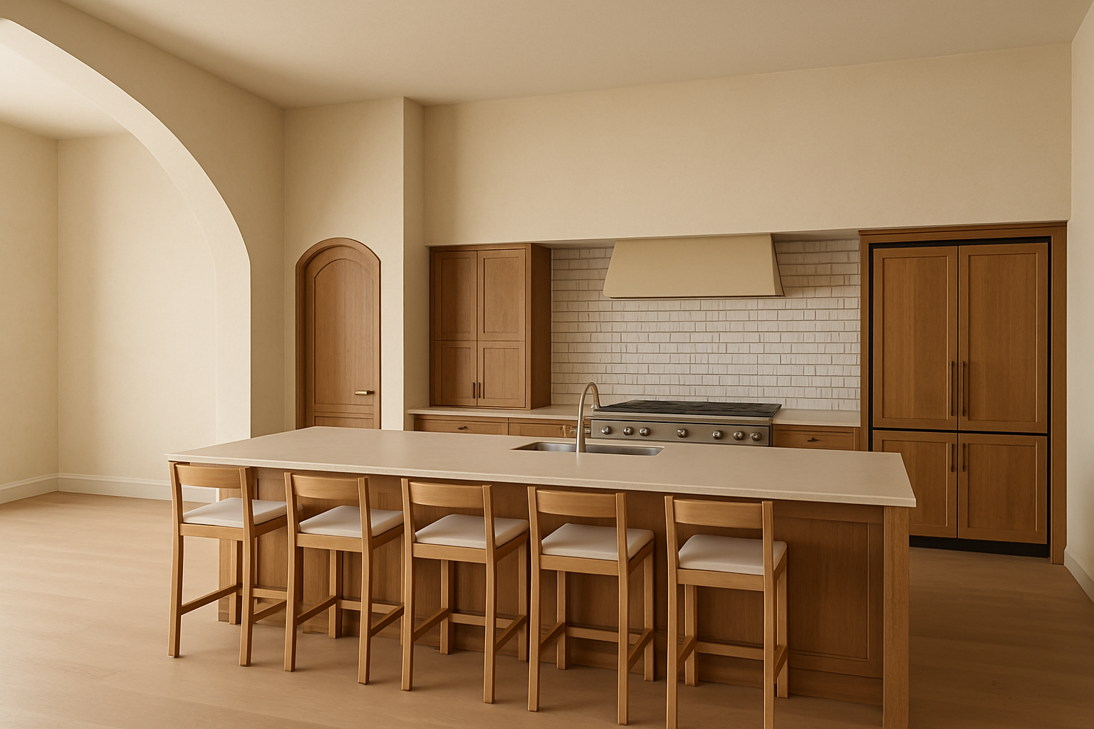 tuscan inspired kitchen with rustic stone plaster walls terracotta floors warm wood beams marble counters and soft golden light architecture