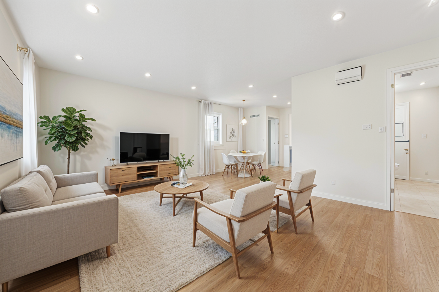 retain the build of the home retain the window placement wall placements living room in the foreground and little dinette down the hallway with two chairs and small table like a bistro set on the middle background of the image