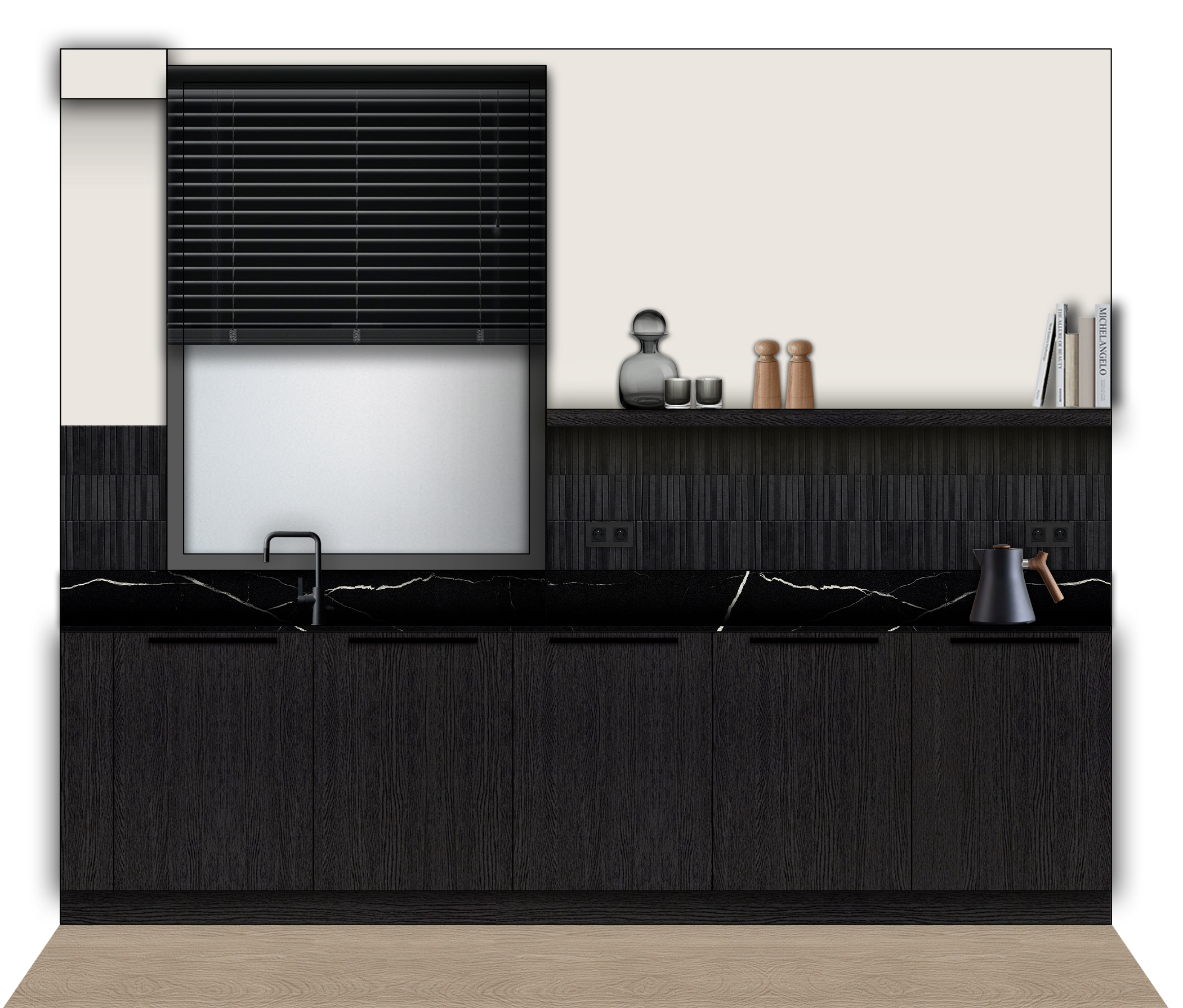 i want you to convert the image from 2d to 3d it is a kitchen area the back wall of the space 3 20 m long and 2 63 m high the cabinets are in black oak veneer finish with a black marble counter top above the counter top there is the same marble at the back for 0 165m height and above the mable the is a black small rectangular tiles and above that a black wooden self on the cabinets there are black metal handles