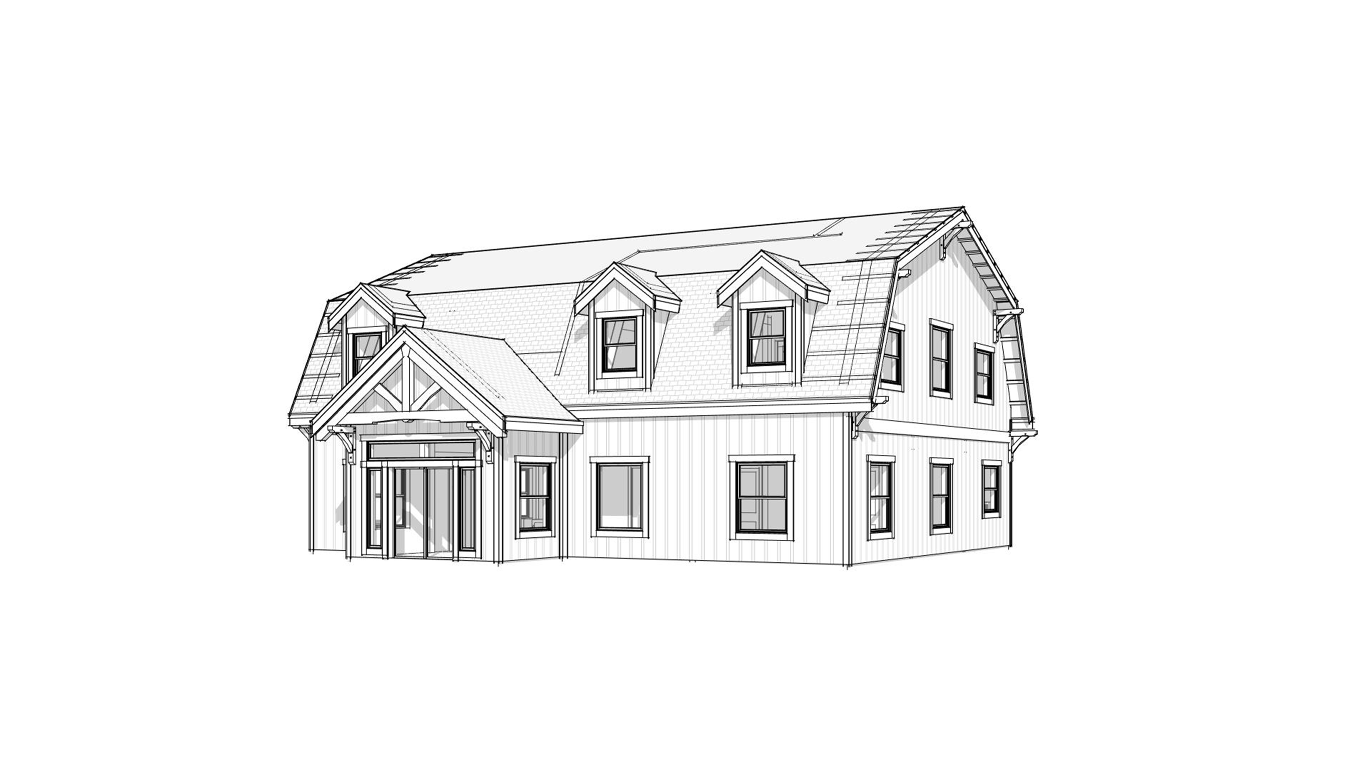 front view of a clean rustic gambrel style barn home architectural exterior home rendered in cinematic day time lighting with bits of blue skies and sunlight coming through the clouds barn home in a neighborhood setting with faint streaks of light coming through trees in the surrounding area warm glow and reflections off of the windows blue sky with big billowy clouds rustic select grade vertical wood siding green manicured landscape around structure with gardens and patches of grass black standing seam metal roof prominent trees in the background high fidelity photorealistic visualization crisp shadow falloff refined facade geometry soft atmospheric depth premium architectural photography mood ultra clean composition and materials black window trim flat roof photorealistic render small concrete path around the exterior of the cabin hide concrete footings grass in the foreground