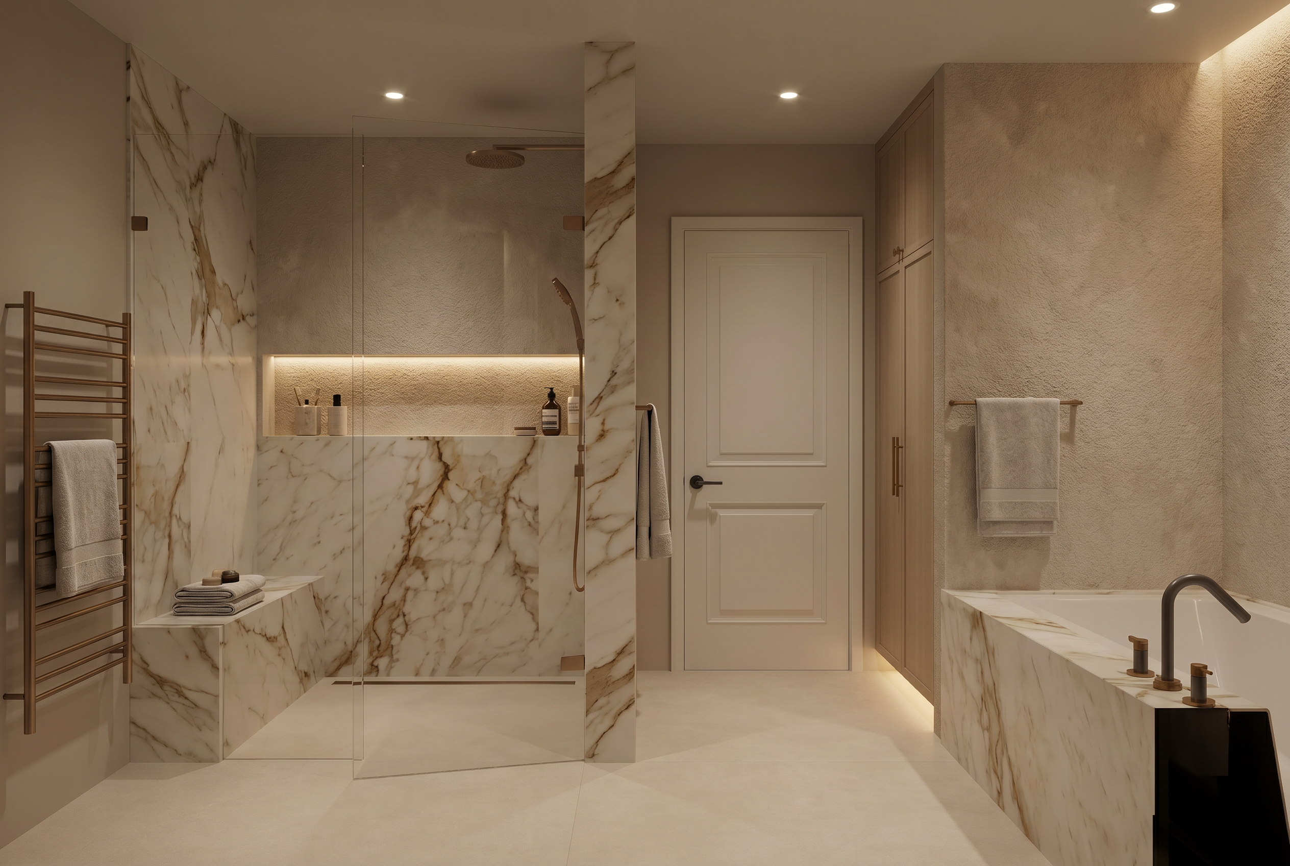 ultra realistic interior rendering of a warm contemporary primary bedroom feature wall with a centered fireplace and custom millwork symmetrical composition with floor to ceiling white oak cabinetry flanking a plaster fireplace surround cabinetry features vertical grain soft matte finish minimal black hardware and integrated drawers below a large flat screen tv is mounted above the fireplace perfectly aligned fireplace is finished in a soft hand troweled plaster with subtle tonal variation surrounding a firebox filled with matte black fire spheres interior firebox lining has a dark herringbone texture flames are natural gas low and ambient to the left a built in window bench with matching white oak cabinetry sits beneath a window with a textured roman shade in a warm neutral fabric to the right a flush wood door in a darker walnut tone adds contrast flooring is wide plank natural hardwood in a medium warm tone with visible grain and satin finish transition detail important where the cabinetry platform meets the wood flooring include a refined tile inlay strip using cl zellige baguette tile gloss finish with 24k gold glaze dimensions 2 x 6 x 3 4 laid in a linear pattern as a decorative threshold band tile should feel handcrafted with slight variation subtle reflectivity and imperfect edges catching light naturally lighting is soft indirect and architectural recessed ceiling lights with warm 2700k temperature gentle wall wash enhancing plaster texture subtle under cabinet shadowing for depth style should feel elevated editorial and timeless architectural digest aesthetic highly detailed materials realistic imperfections accurate light bounce soft shadows and natural color grading camera straight on elevation eye level 35 50mm lens rendering quality ultra realism ray traced lighting global illumination soft reflections micro texture detail
