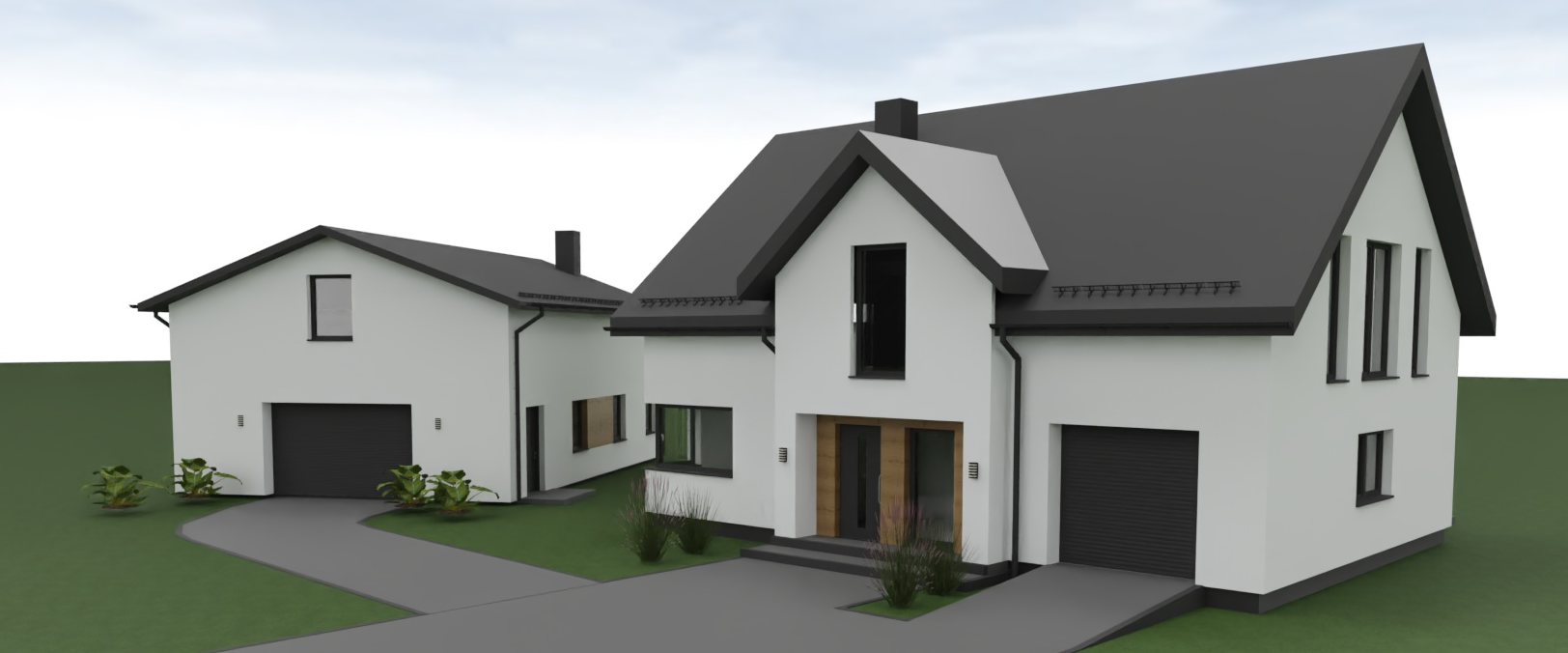 photorealistic visualization of two buildings facade plaster color white roof black flat tiles black gutters add chimney finishing on the buildings add gray paving stones black foundation wall add background of rising sun meadows
