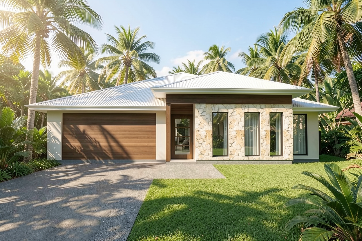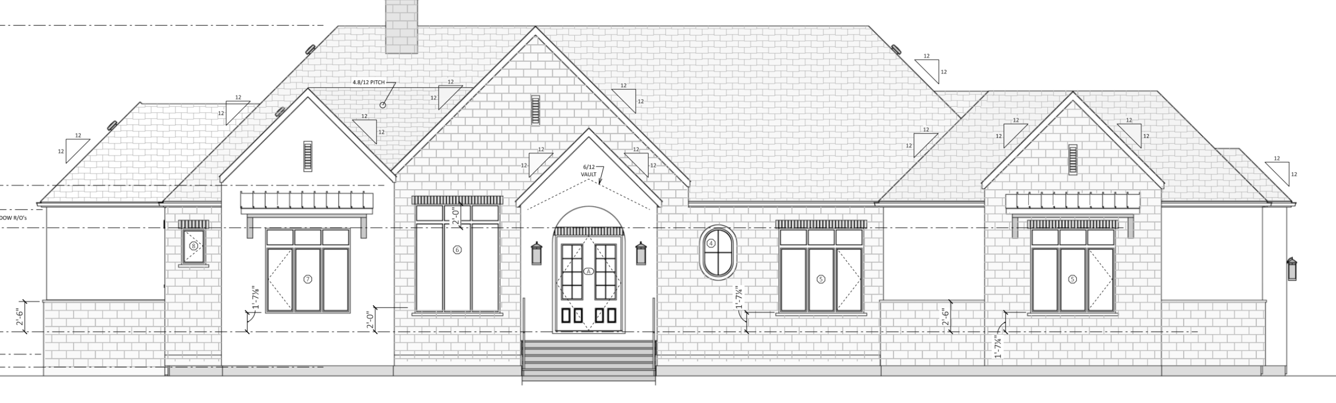 modernist exterior shot dark brown shingles warm stone cream stucco black windows with trees and shrubs black door architecture