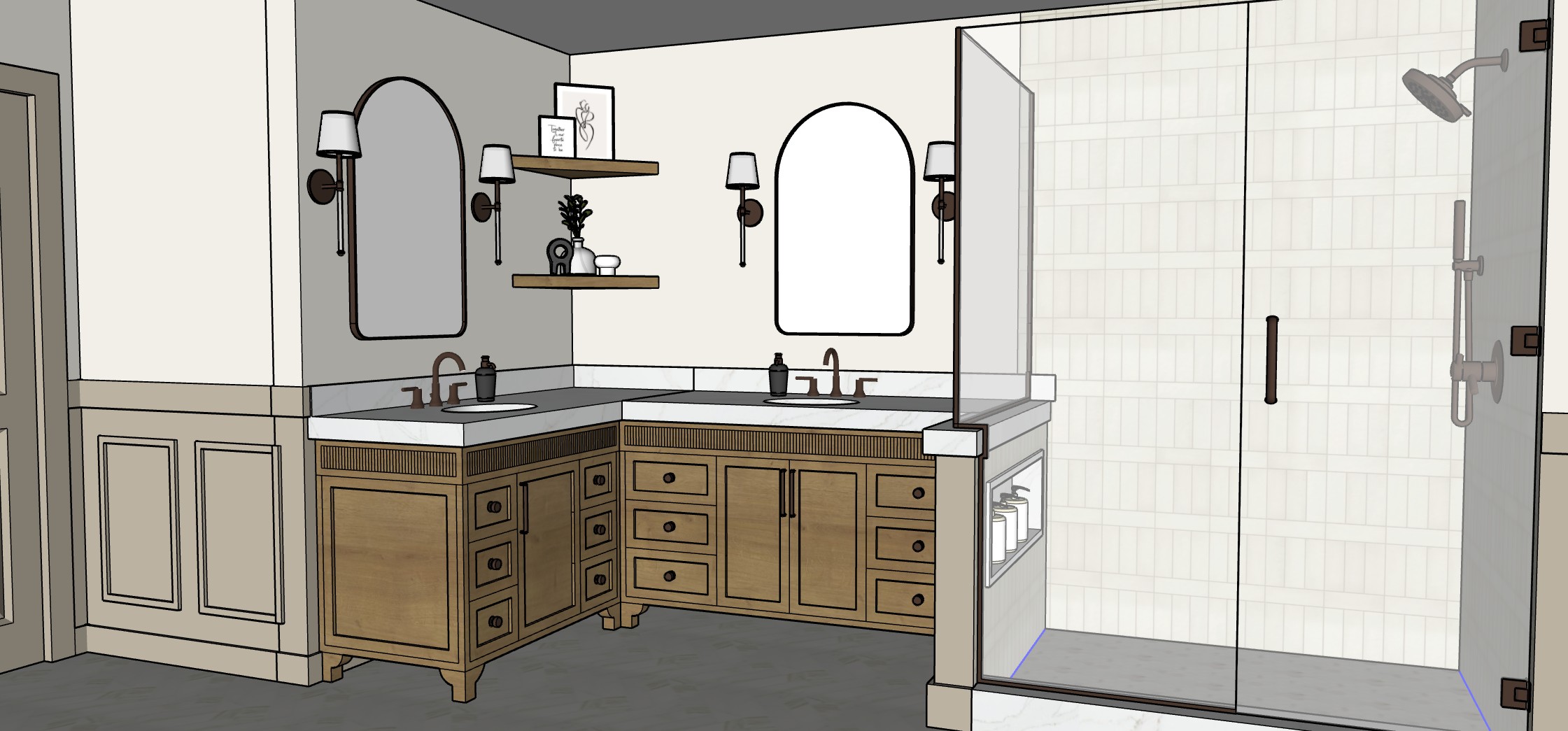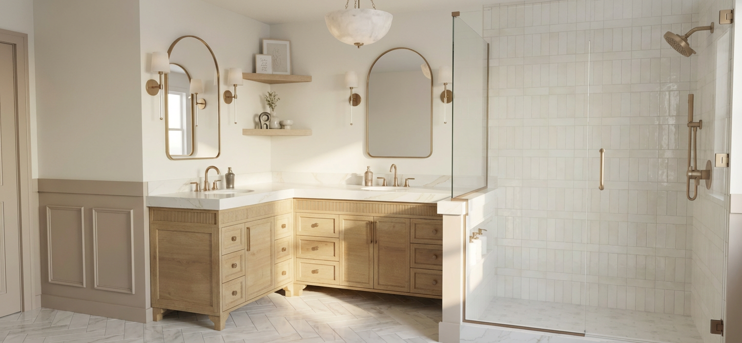 please make this photorealistic the flooring is a 3 x12 polished marble inspired tile laid in a herringbone pattern the fixtures are all a champagne bronze do not show any towel bars on the walls the shower tile is a soft white the countertops are a white quartz with soft and subtle beige veining the doors and casing are the same color as the lower half of the molding which is pashmina by benjamin moore above the molding is alabaster by benjamin moore add soft natural lighting and shadows the vanity is white oak with a reeded fluted detail at the top the countertop is 3 thick the sconces have an acrylic detail