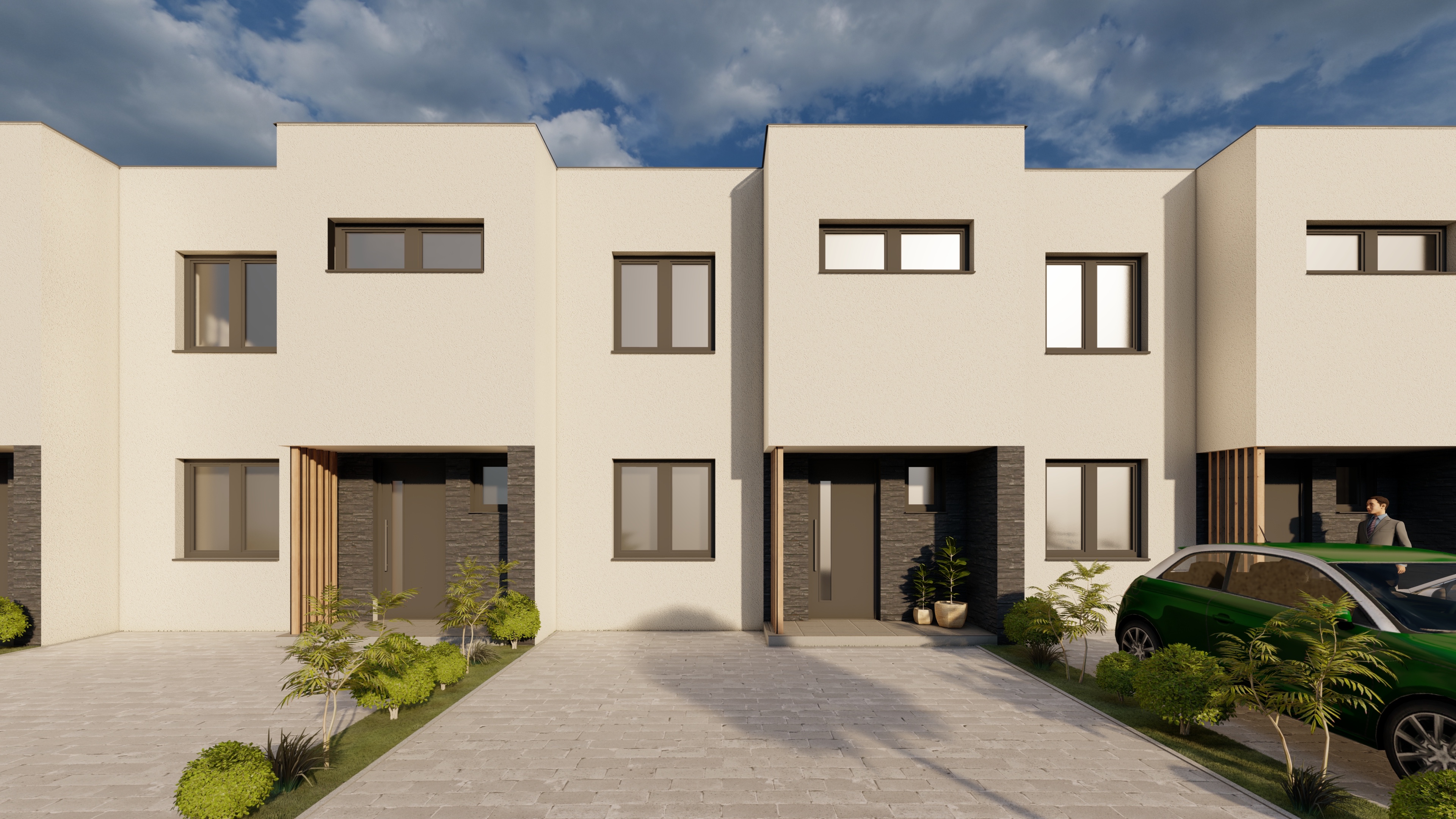 ender a photorealistic 3d perspective of this house reference the current material style beige grey brick with homogeneous colours concrete arch keep model geometry the same windows doors roof walls make a lush vegetation top of the building over the wine shop do not change the view only enhance the current materials and make the landscape nicer vegetation detailed textures in the glass reflections and a vibrant clear sky with light atmospheric depth render in hyper realistic architectural visualization