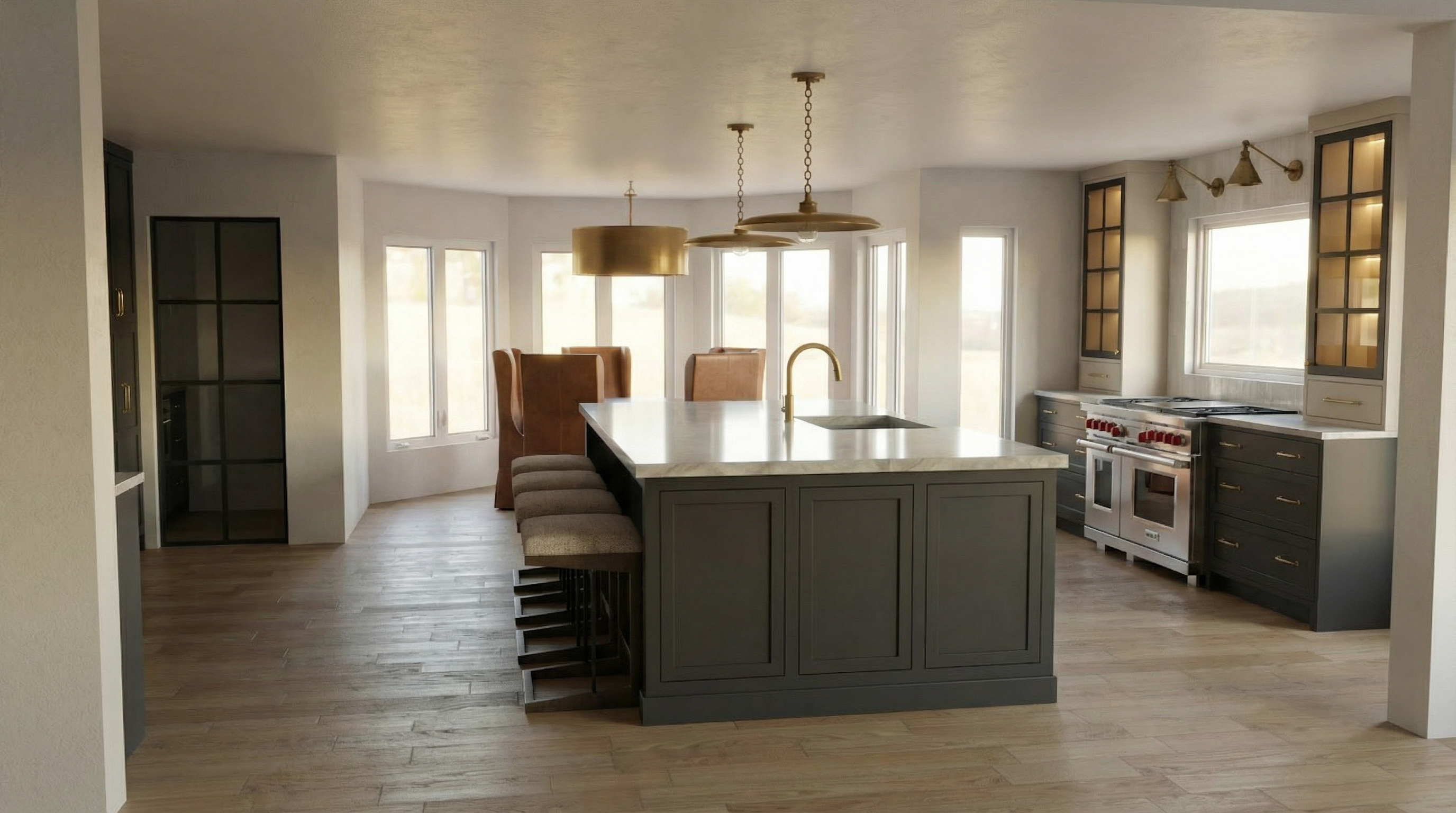 render again with the same prompts but make all cabinetry above the countertops a soft beige