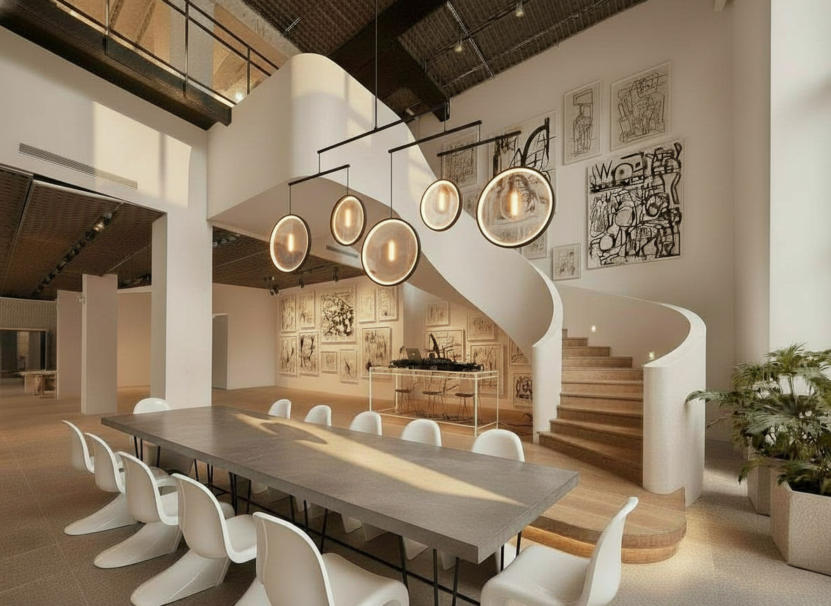 add a chandelier over the table that is the appropriate scale and fracturing the light from the window while casting a warm 2700k amber glow onto the table the fixture should feel historic and utilitarian yet thoughtfully considered by the artist who selected it for the space it should speak to the light from the giant arched window in the space and whisper it as a secret to the table