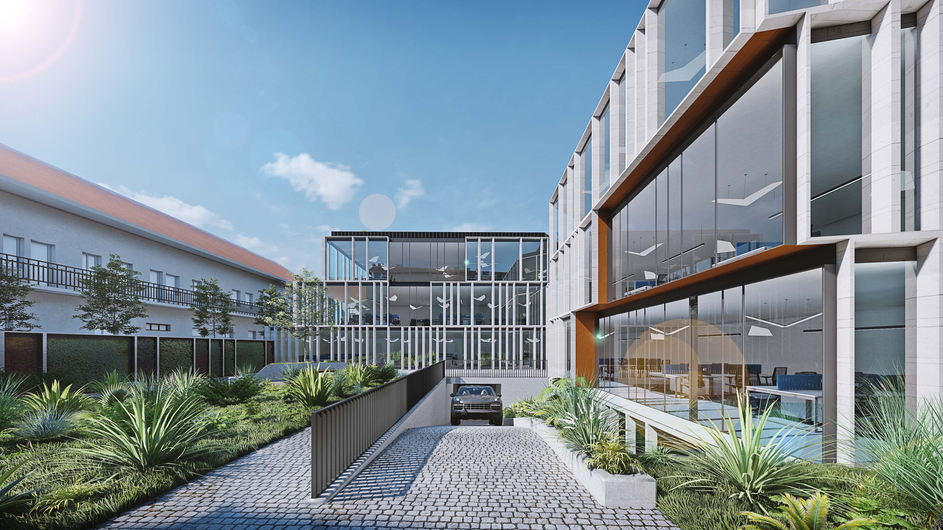 important preserve the existing geometry and the existing context exactly as provided do not modify alter reinterpret add remove scale or reshape any geometry do not change the site surroundings street layout neighboring buildings vegetation or context elements do not modify geometry scale proportions buildings road layout sidewalks or surrounding context in any way do not change text photorealistic architectural rendering clean and balanced contrast calm cinematic mood style contemporary european residential architecture minimalist premium understated include people seating and standing inside do not alter the church color soft overcast evening atmosphere diffused cold natural daylight with subtle blue grey tones cinematic architectural mood warm interior lighting 3000k glowing from inside creating strong contrast between cool exterior and warm interior large glass surfaces with realistic reflections soft mirror effect subtle environmental reflections of sky and surroundings gentle fog diffusion in background wet pavement with smooth reflective surface soft light bounce and blurred reflections high dynamic range lighting realistic global illumination soft shadows calm and minimalist nordic mood photorealistic architectural visualization balanced exposure no harsh highlights