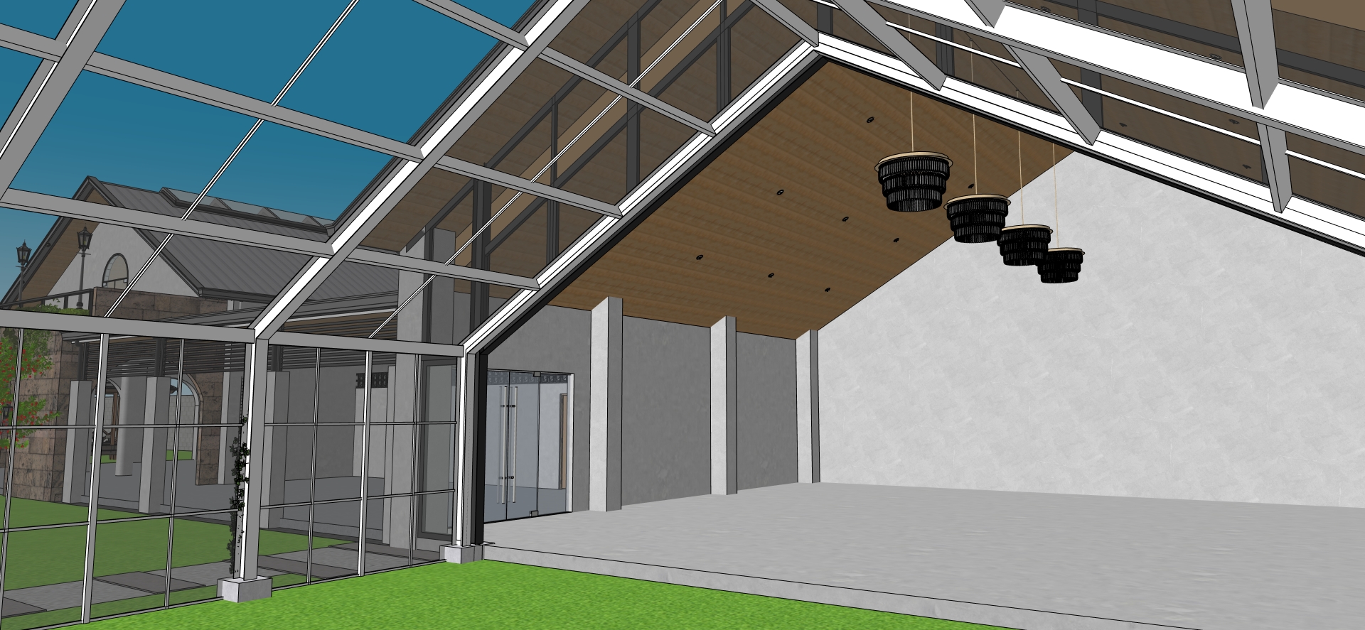 green floor is artificial grass and gray floor is polished concrete floor brown ceiling is pvc wood look planks all solid walls are stucco finish turn the 4 chandeliers shown in the photo into crystal chandeliers and the black circles on the ceiling are recessed downlights with stainless trims add realistic sky