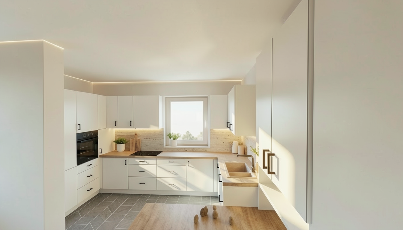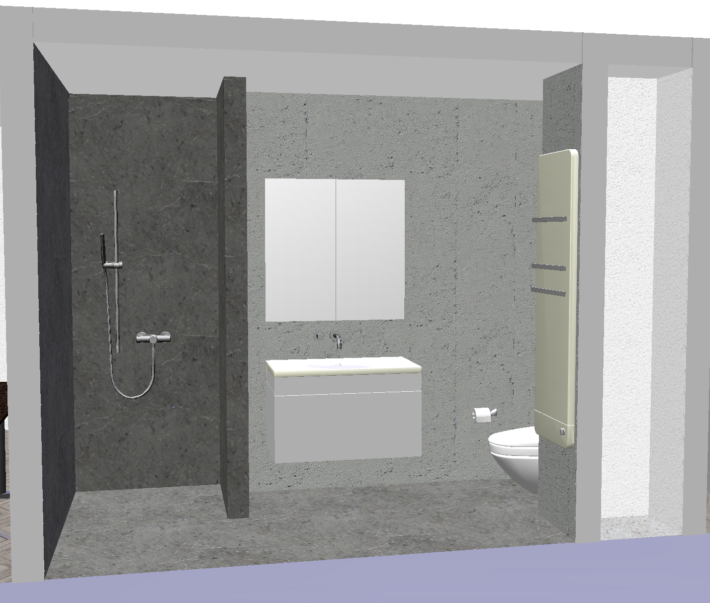 genau dieses rendering berarbeiten fotorealistisches innenraum foto exakt gleiche perspektive und kameraposition wie das hochgeladene referenzbild 100 identische raumgeometrie exakt gleiche m belanordnung weiches nat rliches tageslicht ganzer raum zus tzlich k nstlich ausleuchten sanfte realistische schatten realistische materialien stoff mit leichten gebrauchsspuren hochwertige oberfl chenreflexionen lavabo inklusive unterbau aus marmor collemandina grigio in braungrau dunkel lavabo innen ebenfalls collemandina im unterbau im obersten drittel eine griffmulde ber die ganze breite unterbaum bel mit unterbaubeleuchtung hinter dem lavabo eine vola wandarmatur in edelstahl geb rstet vollkommen rahmenloser und bis auf f nf zentimeter versenkter und hinterleuchteter spiegelschrank mit spiegelung links neben dem lavabo ist die dusche armatur ersetzen mit thermostatmodul axor select 460 90 mit stabhandbrause und grosser brause mit anschluss aus der wand alles in edelstahl geb rstet vertikales led ber die ganze raumh he ganz links hinten in der dusche rechte seite in der dusche kein led w nde in der dusche und boden collemandina grigio in braungrau alle anderen sichtbaren w nde sind sichtbeton die toilette ist in der nische hinten auf der rechten seite moderne toilette vertigo wandh ngend in farbe weiss matt tecelux bet tigungsplatte toilettenpapierhalter in edelstahl mit papier an der wand links von der toilette an der grossen wand handtuchradiator in edelstahl an der fl gelwand auf der rechten seite mit weissen badet chern links und rechts vom lavabo handtuchstangen und handt cher in weiss schwarze steckdose rechts vom lavabo schwarze runde deckeneinbauspots in der nische vorne rechts ist ein unsichtbarer schacht ohne irgendwelche installationen sehr moderner minimalistischer look nat rliche farbwiedergabe golden hour feeling hell ausleuchten das bild muss wie eine professionelle fotografie aussehen es soll ein echtes und reales foto sein canon eos r5 35 mm festbrennweite f 2 8 hyperrealistisch dslr qualit t raw aufnahme 8k aufl sung extrem scharf perfekte tiefensch rfe professionelle architekturfotografie
