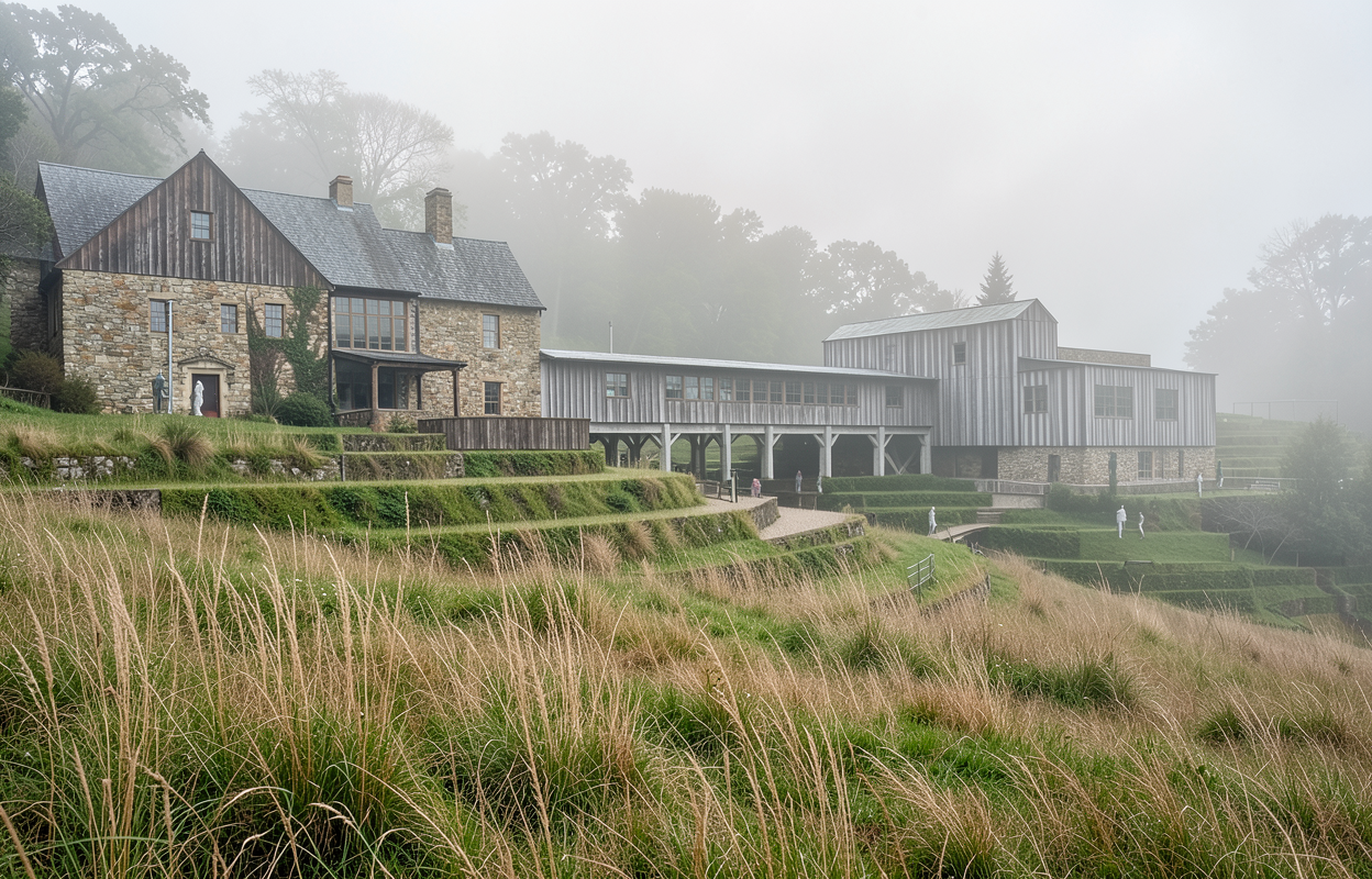 buildings set in hillside old stone farmhouse covered bridge with large windows mill house with vertical shiplap and windows tall grass foreground fog trees in background