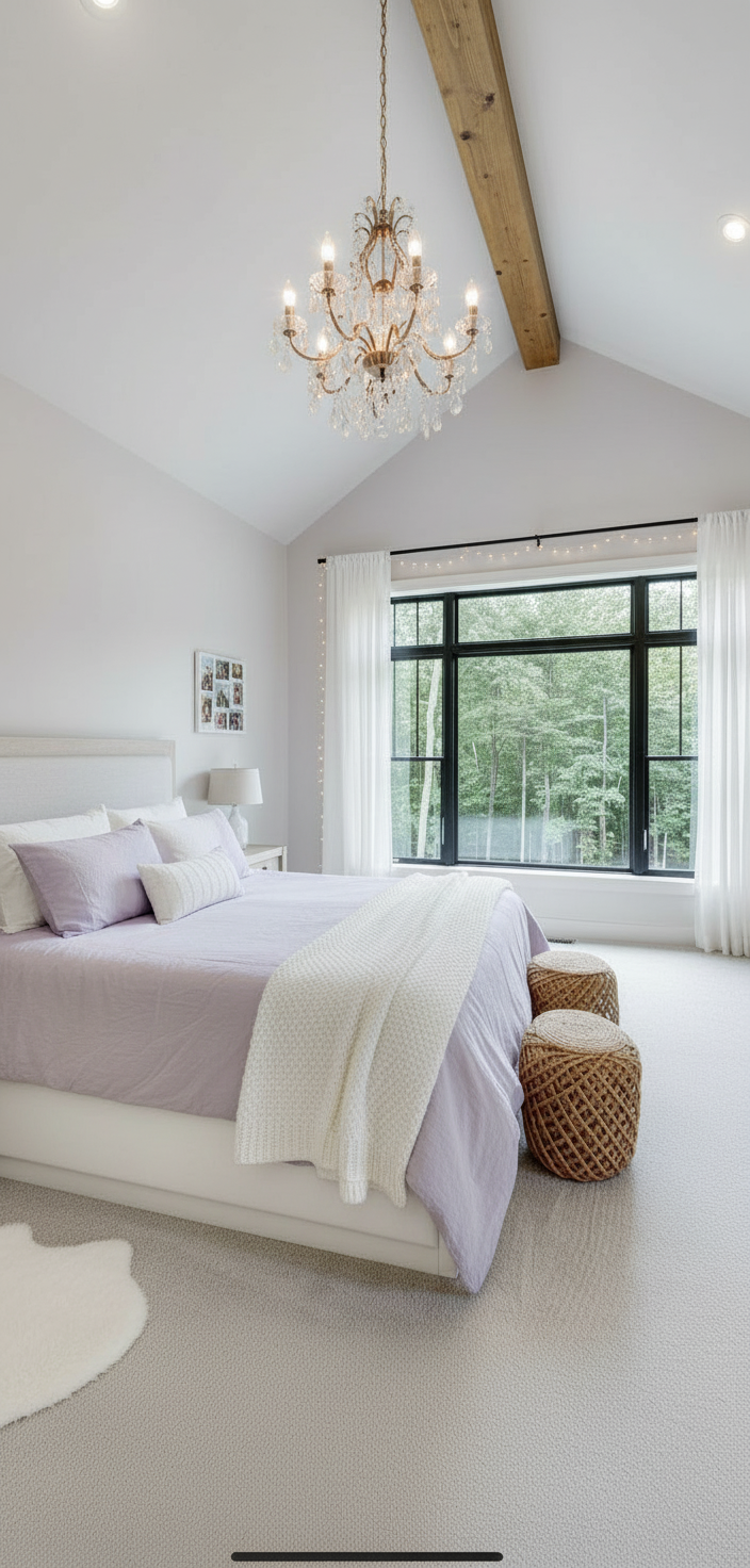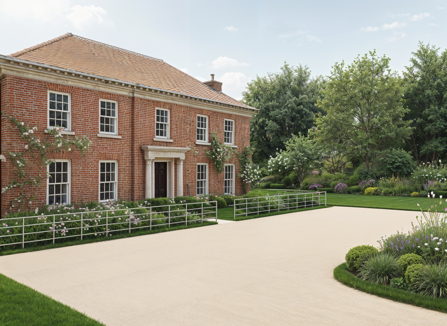 i would like you to render this house in 3d with a painted brick and painted siding the brick color will be sw mushroom anywhere where there is brick the sw whisper paint color will be on any area where there is siding including on the front right of house where the windows are on the front right side please put the sw whisper on the roofline and the garage in the back please add gas sconces to the front brick columns half way up the opening for height please add evergreens for landscaping and a stone sidewalk and grass