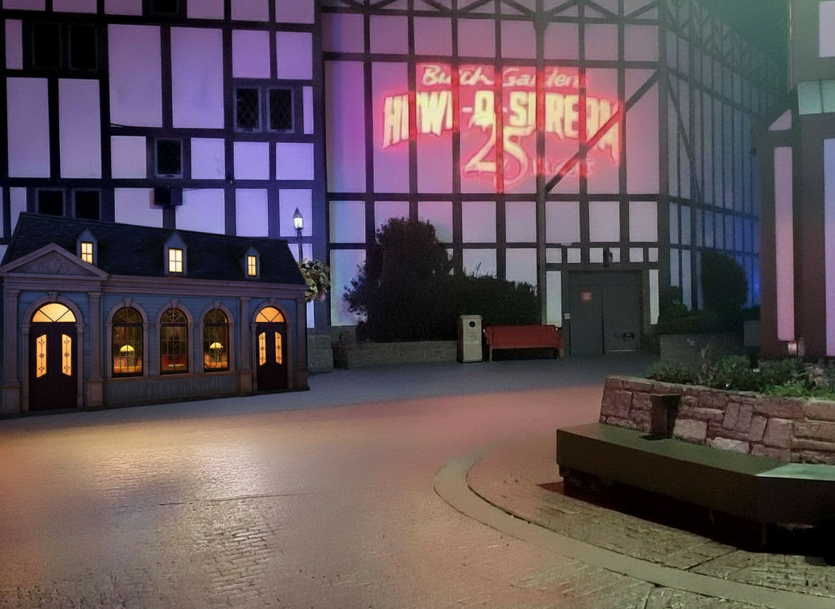 match the lighting on the front of the small structure on the left to the environment s lighting cast light and shadow on the ground in front of the small structure coming from its windows do not change anything else