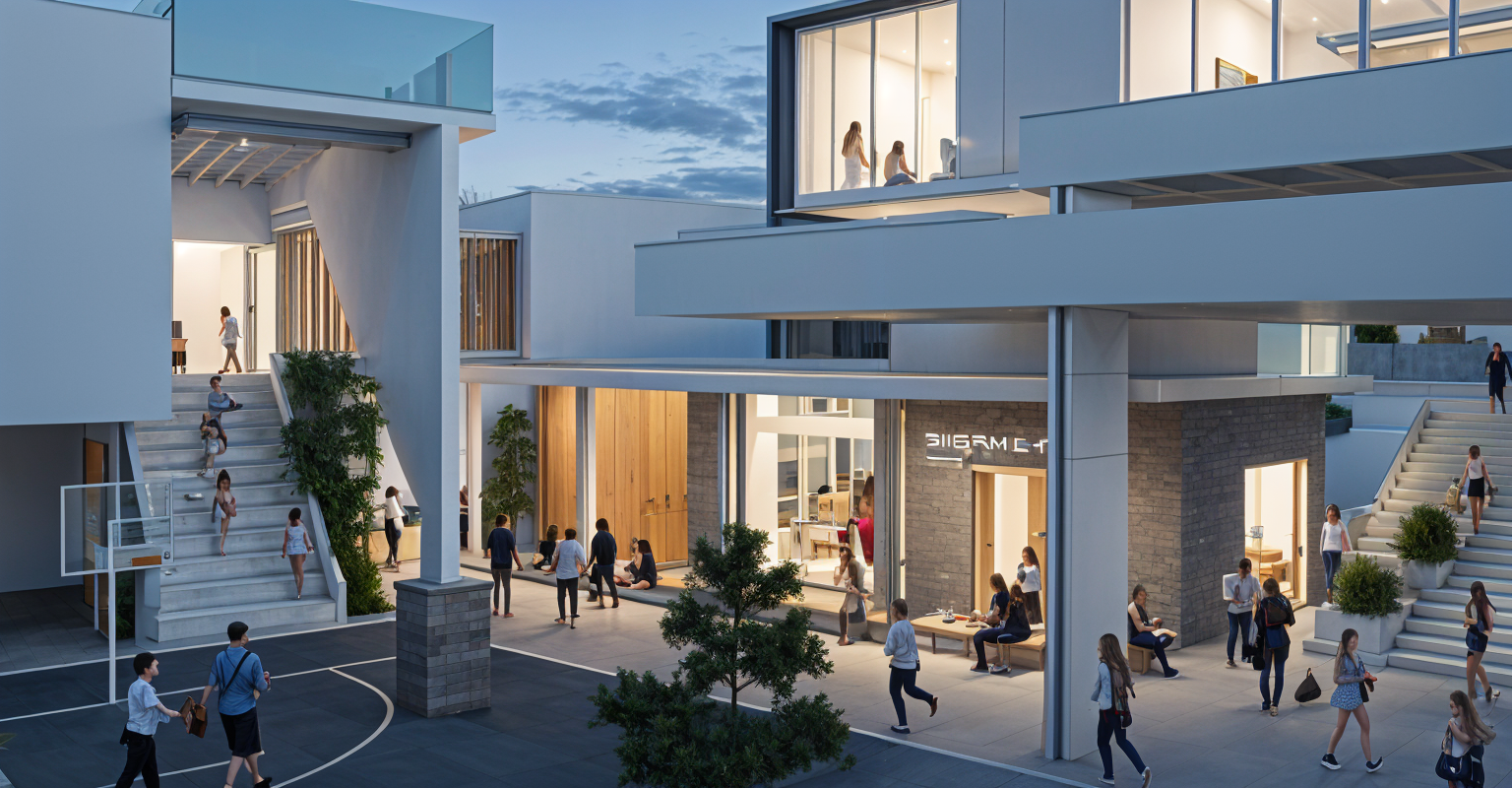 bobby mcalpine exterior shot make this a sport center render located inside a campus in china make the concept simple woody yet aesthetic with nature make it look like a sport public space with people make it look like evening and dont use all wood combine with grey make the room closed still architecture