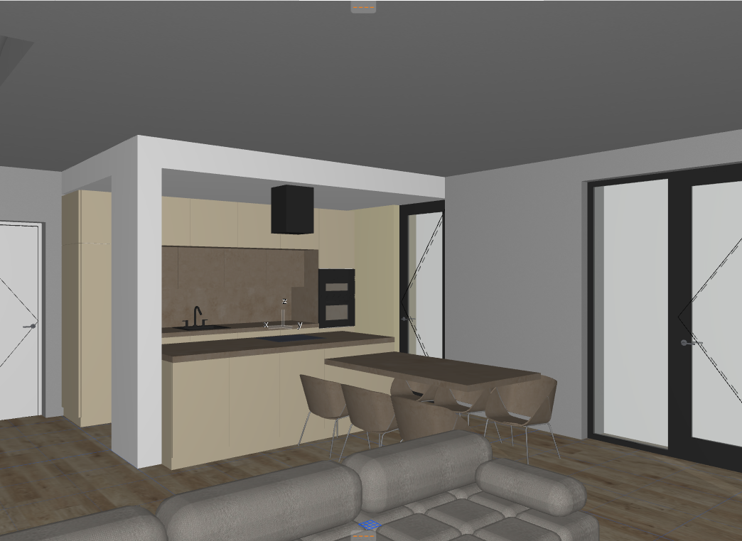 render a contemporary kitchen and living area with a minimalist design use a soft neutral color palette walls in light gray flooring in rich walnut wood kitchen cabinets in cream and backsplash in warm beige stone incorporate a sleek matte black oven and hood the countertop should be dark brown with subtle veining for texture dining chairs are taupe leather surrounding a medium walnut wooden table a plush light gray sectional sofa with a tufted pattern adds comfort illuminate the room with natural light streaming through large windows creating a serene and inviting atmosphere