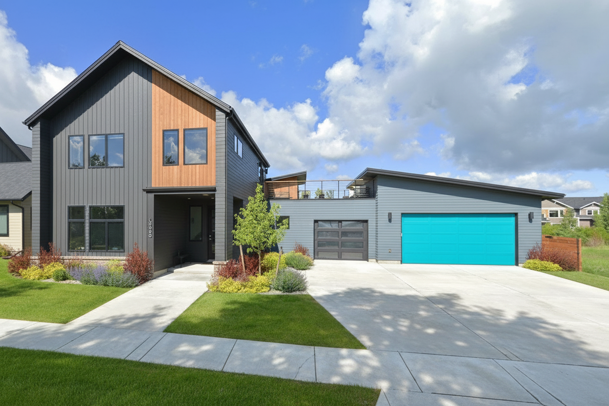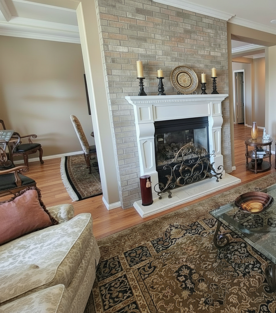 create a render in hyper realistic architectural visualization quality 8k architectural features must remain in place the wood cabinets are a light oak color little warmth the black cabinets are matte the countertop and backsplash is white with gray cloudy veins the glass cabinets have a black band trim dont delete anything from the image the spatial configuration must remain unchanged add gentle reflections soft shadows slightly enhanced color richness and luxurious level realism improve depth and realism through wood grain richness keepi the entire scene exactly as originally designed use general daylighting please add some decor throughout the kitchen especially in the glass shelves do not add any lighting in the ceiling add some trees visible outside the window