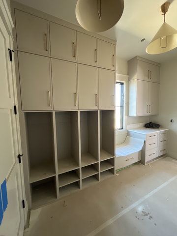 do not change the cabinets in any way preserve the exact cabinet colors materials finishes dimensions door and drawer styles hardware spacing alignment and all geometry exactly as shown do not alter the countertop shape backsplash appliances flooring lighting fixtures or wall structure only remove the construction materials clutter and mess from the scene clean the room and make it look finished and staged add a few simple tasteful home accessories appropriate for the style of the space but do not add or remove any furniture windows or architectural elements maintain the original lighting direction and realism enhance clarity and polish the photo while keeping the cabinetry and room design completely unchanged do not alter the lighting to keep the cabinet colors as they are in the image remove the pendant lights add flooring add a simple view out the window stage for a mudroom