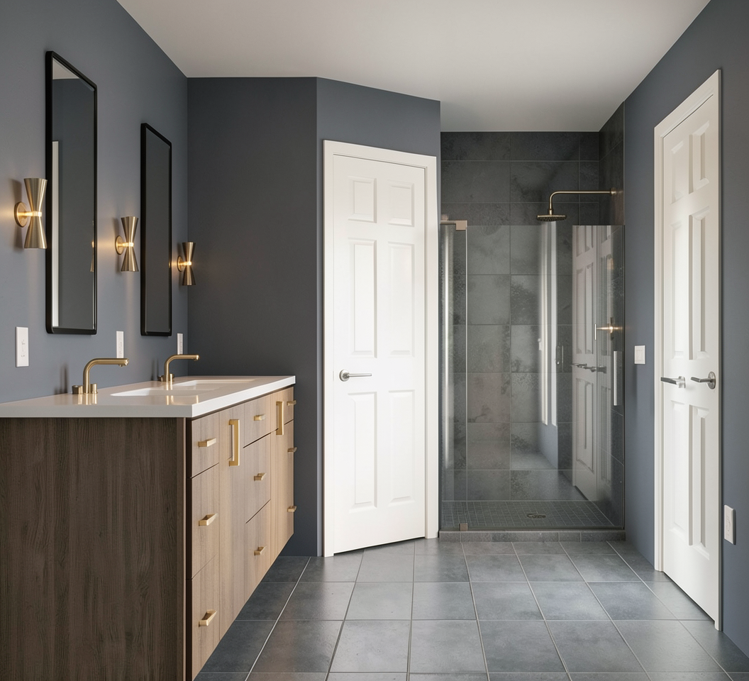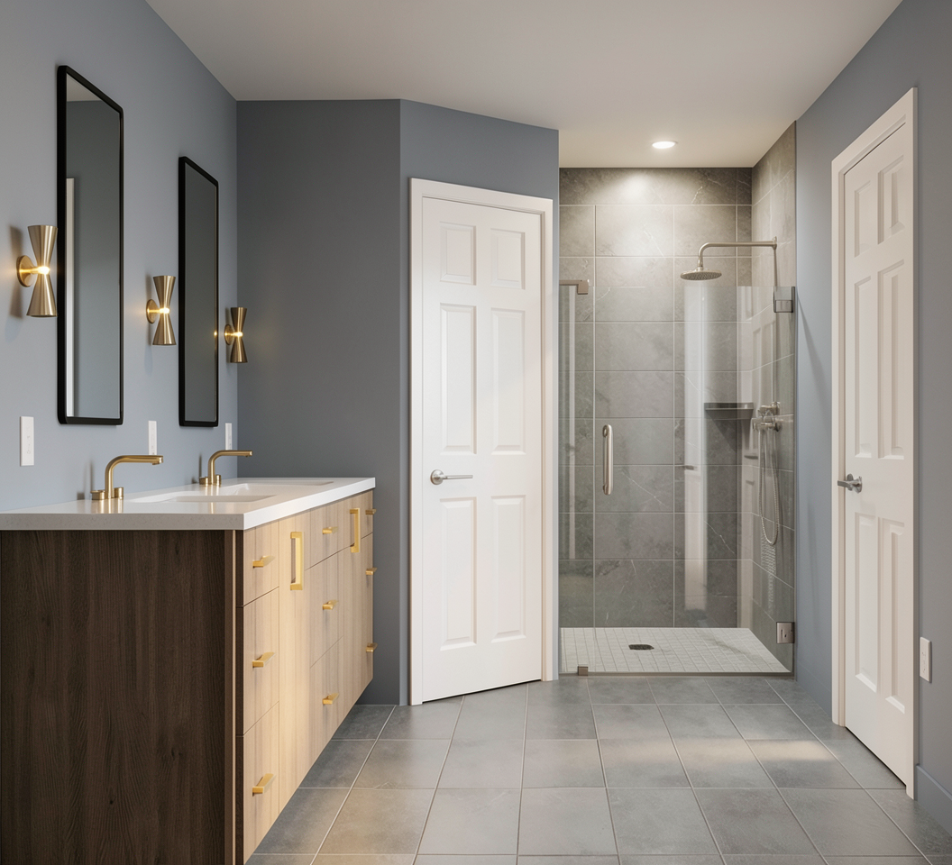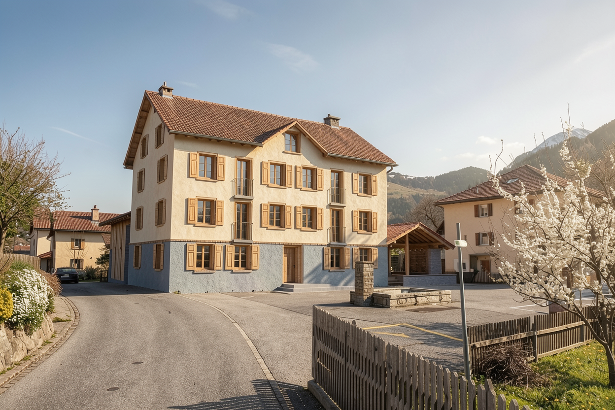 modern exterior shot late afternoon to early evening include some light clouds include landscaping and some flowers but not a lot of flowers architecture