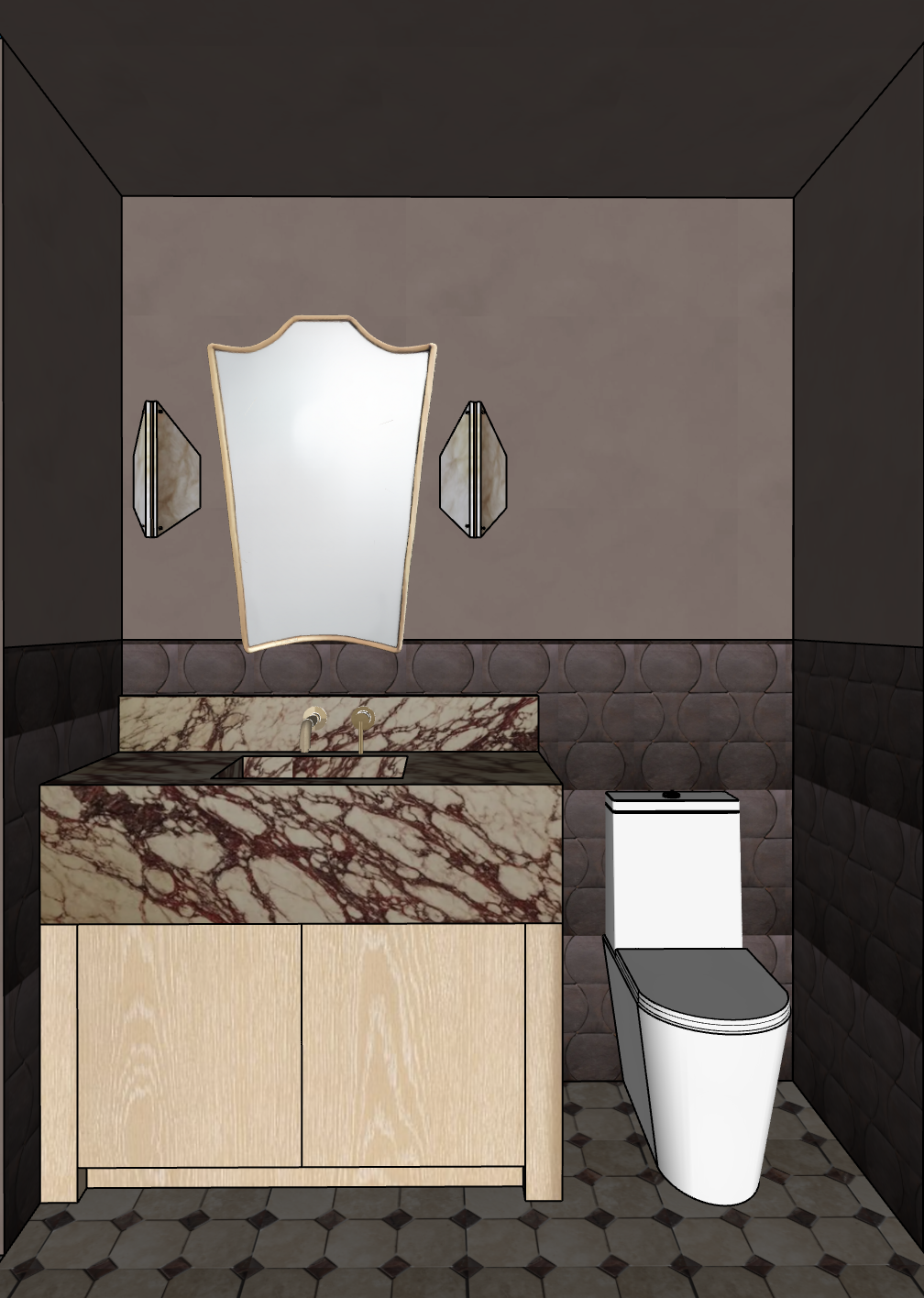 a beautifully rendered bathroom with a sophisticated and elegant atmosphere the walls are a rich chocolate limewash brown creating a warm and inviting feel the mirror is framed with a luxurious gold trim reflecting light softly the countertops feature an exquisite maroon and cream marble pattern adding an element of opulence complementing the countertops wooden cabinetry is a light natural oak offering a subtle contrast the toilet is a sleek modern white harmonizing with the other elements the floor displays a classic hexagonal tile pattern in muted beige and maroon tones enhancing the room s overall elegance the lighting is soft and ambient casting a gentle glow throughout the space