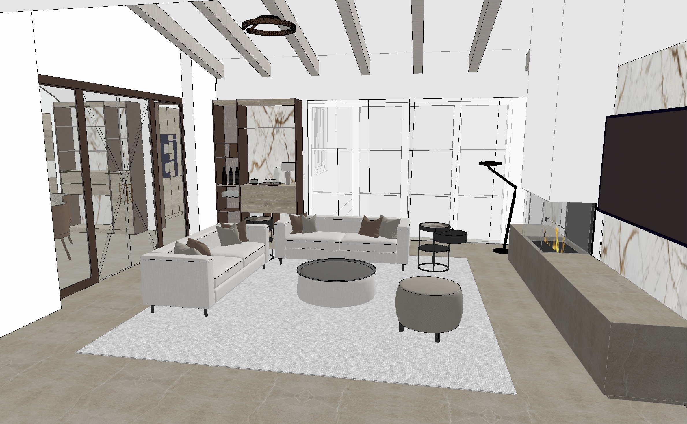 keep interior design and furniture position as it is realistic photo of a living room withh fireplace in daylight bright and welcoming atmosphere white walls ral9016 white built in cabinets ral9016 open shelves in light stained oak wood non red or non yellow oak wood light fabric sofa with black feeds couchdesk in black glass top and light fabric bar shelf from stone wood and bronze brass metal light white semi transparent curtains light leather upholstery poof betwen couchdesk and fire place white ceiling beams keep the position as it is decorativeliving room elements such as candles coffetable books warm 2700 k lighting occhio ruggio floor lamp harmonious composition tidy and elegant with a cozy lived in feel door as it is out of glas with metal bronze brass frame