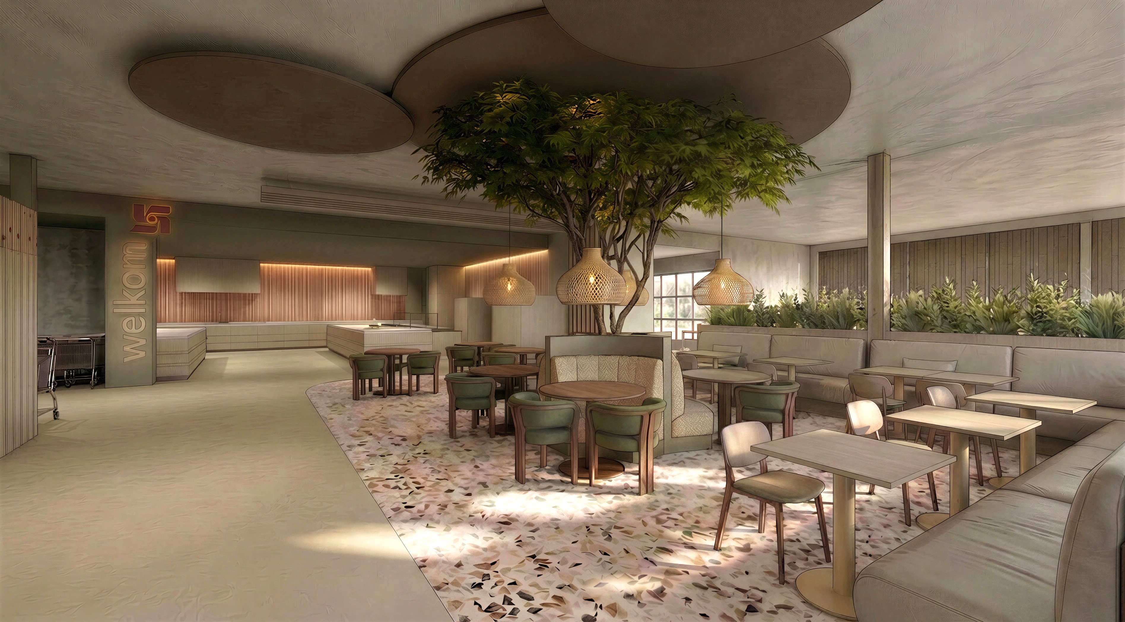 a hyper realistic architectural photograph of the interior featuring the exact same geometry and layout as previously established the central specific terrazzo floor zone located precisely where it was before is updated with a highly refined fine grain terrazzo finish characterized by small subtle micro aggregate speckles instead of coarse chunks all surrounding elements including other floor materials furniture cabinetry walls windows and the lighting setup soft natural sunlight warm led accents remain completely unchanged and identical to the original scene shot on phase one xf 8k resolution global illumination raytraced reflections clean minimalist aesthetic