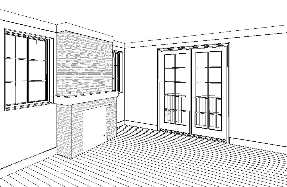 interior elevation of a traditional farmhouse style fireplace with stacked arizona stone rustic barn wood beam lintel dunn edwards cool december white painted walls white painted crown and base molding walnut wood plank flooring abundant natural light entering through the windows with white window frames green vegetation outside