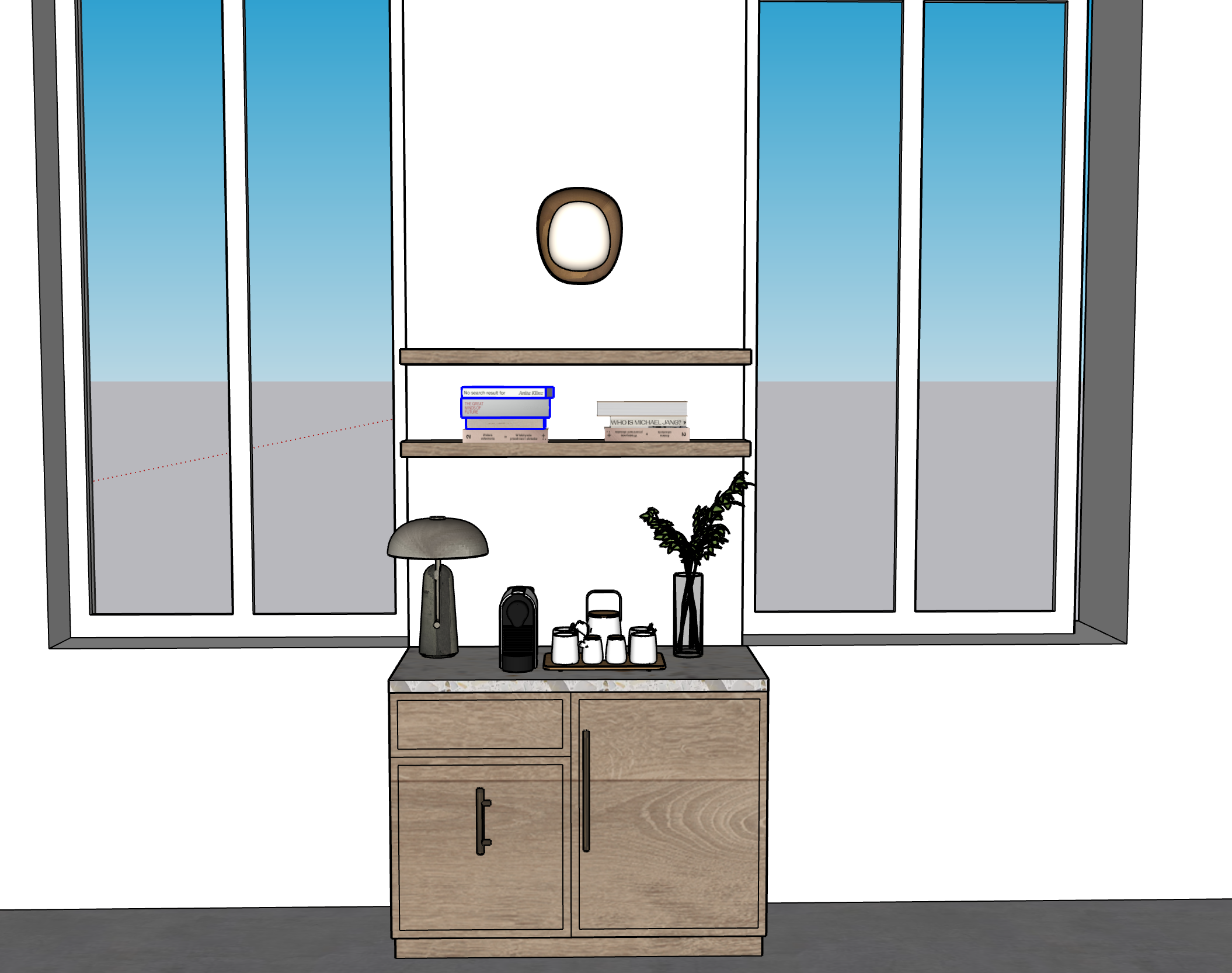 please make the lighting soft even warm and bright keep material as they are shown in the image make the material on the cabinet front white oak make the walls white make the view outside the window have a fire escape and buildings