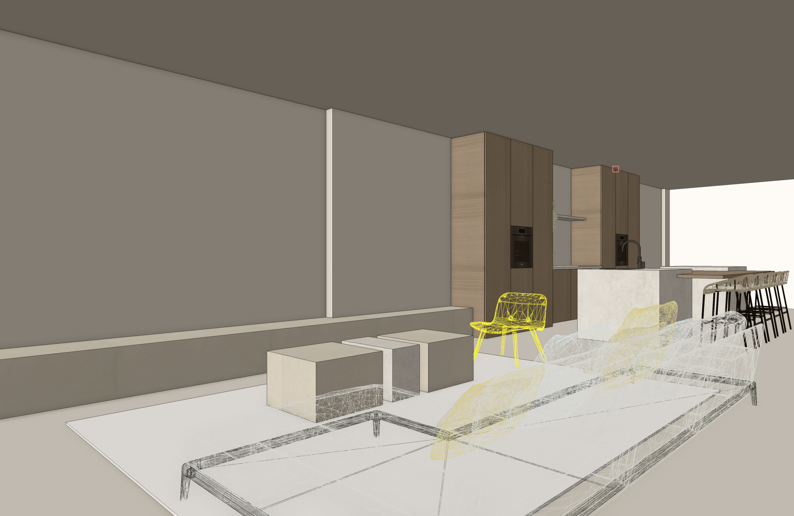 make a photorealistic render wtihout changing the perspectif keep the materials close to the original and put a tv on the wall and a minimalistic fireplace put a horizontal ligth above the kitchenisland and put in the back black framed sliding doors