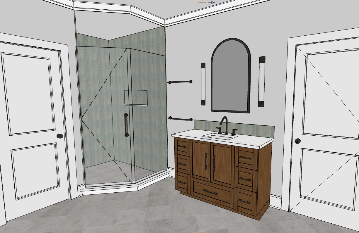 make photorealistic add warm recessed lights make wood vanity a little rustic