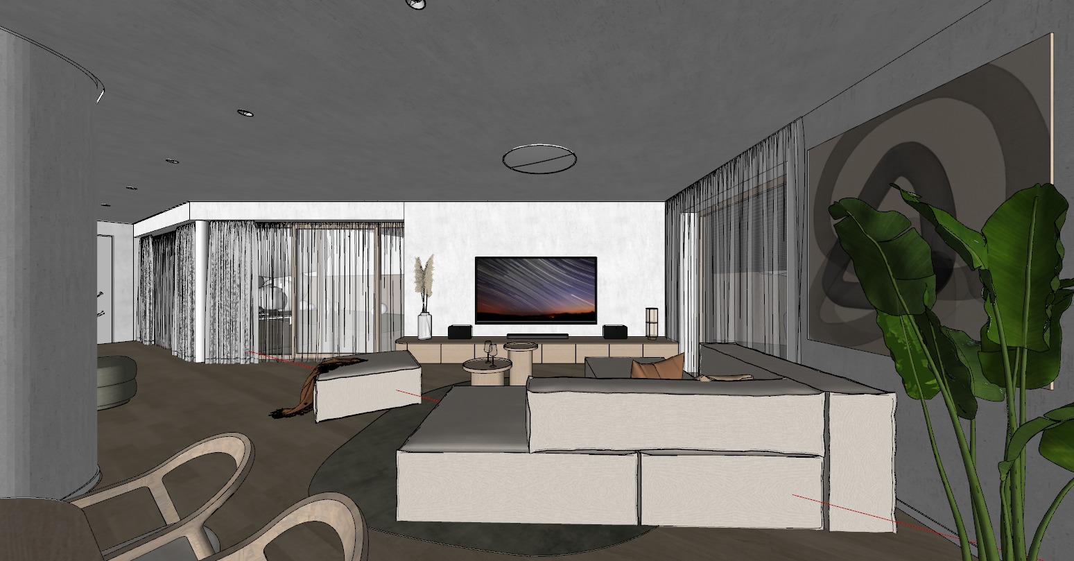 add plaster texture on wall in microcement light beige style add lights on spotlights add light texture on wooden parts it has to be wood like in origin picture preserve every object and dont add any new objects make daylight in render change the plant more realistic sofa with beige fabric in textured canvas vases from glass on furniture make translucent curtains daylight from windows