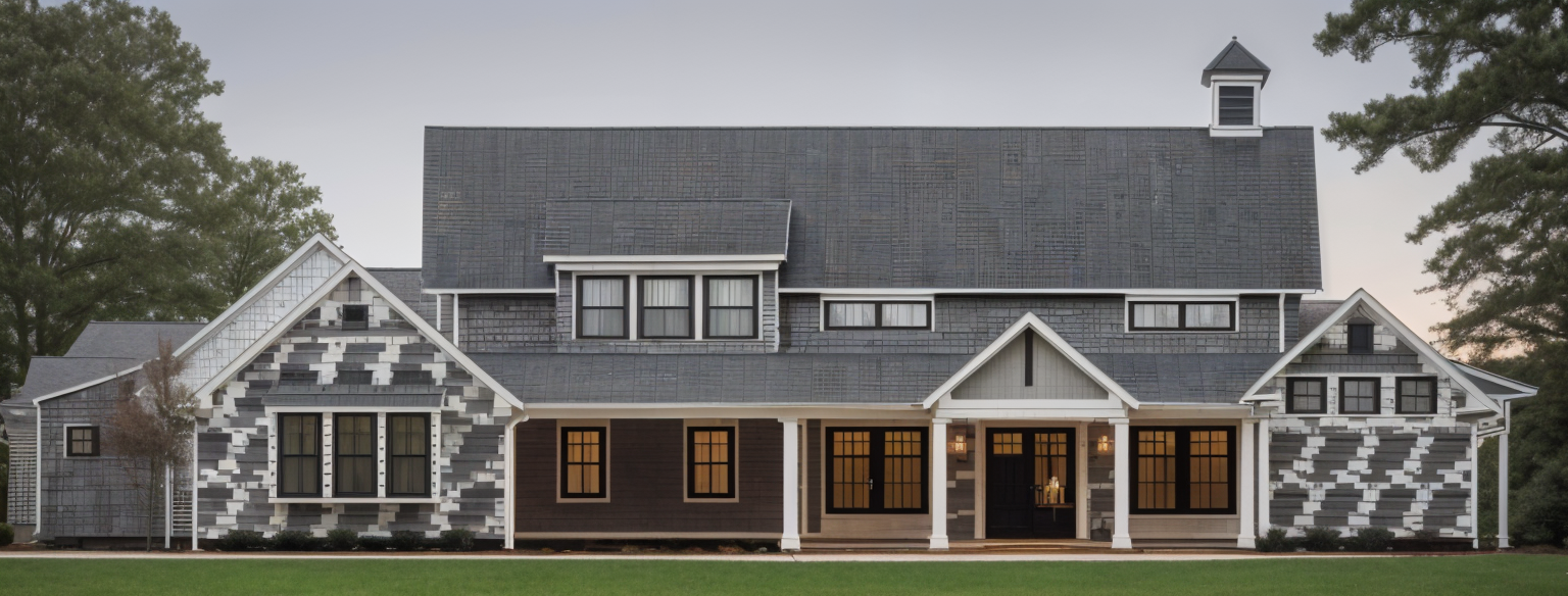 expessionism exterior shot black steel roof dark gray siding gray and white stone and medium brown wood accents architecture