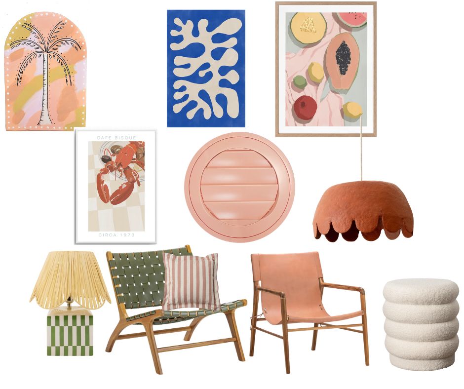 a bright and colourful mid century style lounge room with lots of patterns