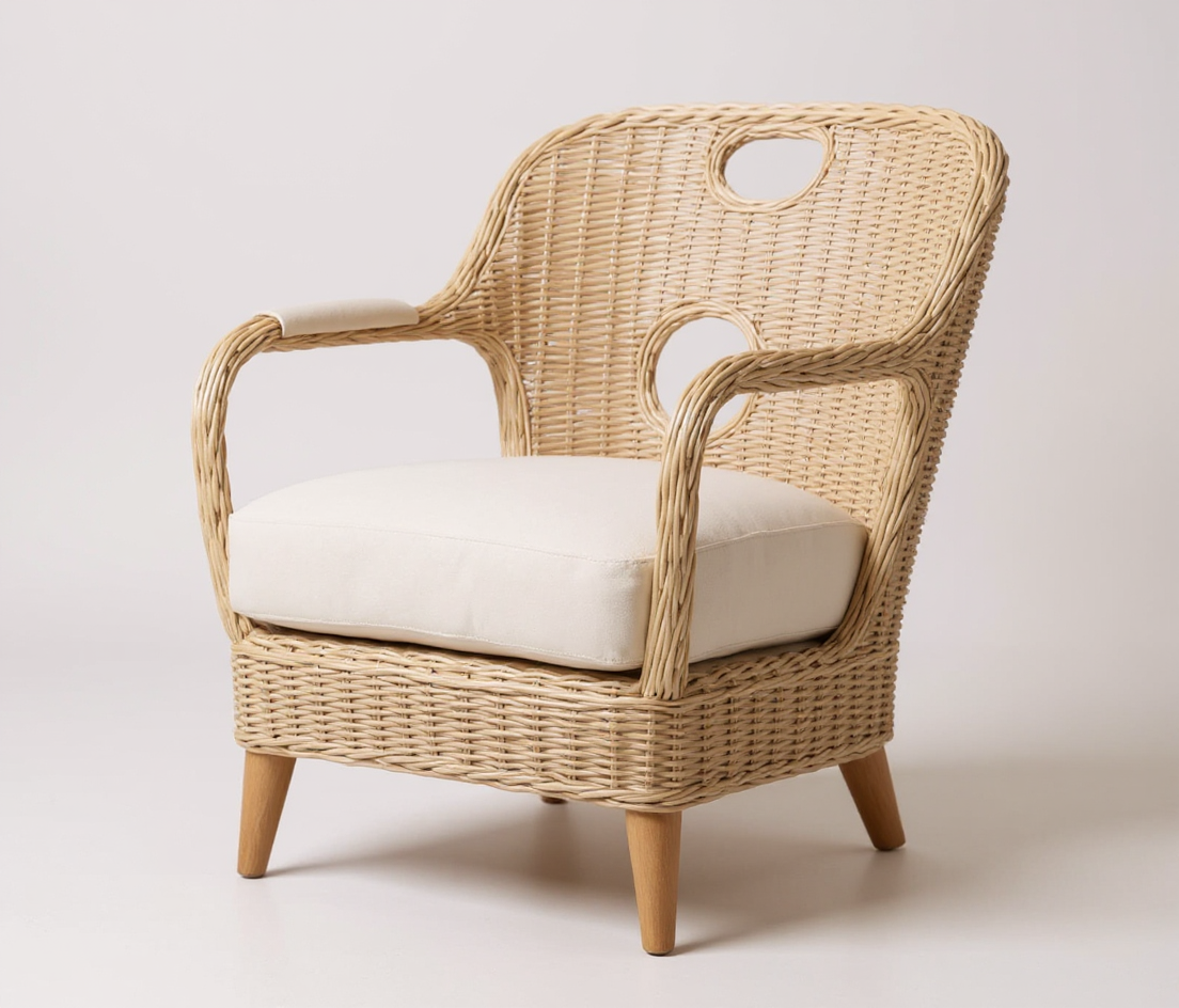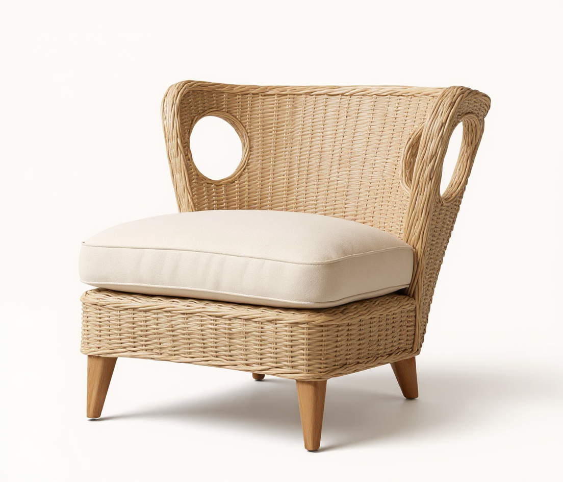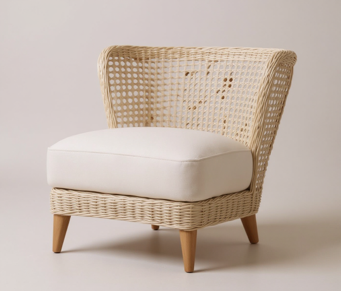 back portion in light powder ivory rattan weaving finish upholstered white seat and back with m hole design back