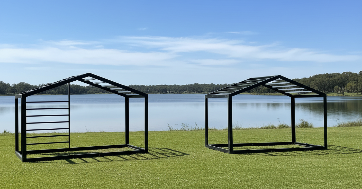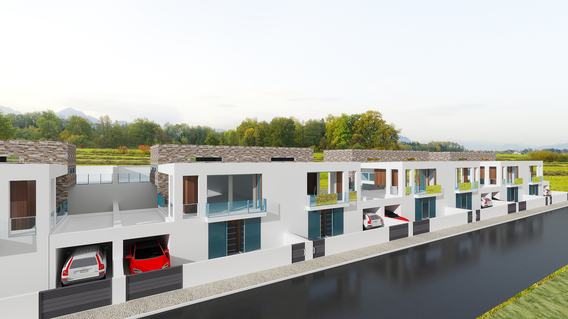 render a modern row of white townhouses with large glass balconies and wooden accents surrounded by a lush green landscape the rooftops feature a textured stone design include parked cars in the driveways a white car in one and a red car in another the scene is set during a bright clear day with a calm peaceful ambiance the sky is a soft blue enhancing the serene atmosphere