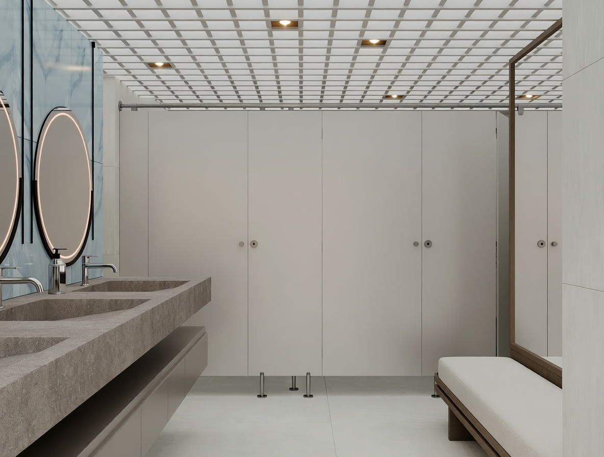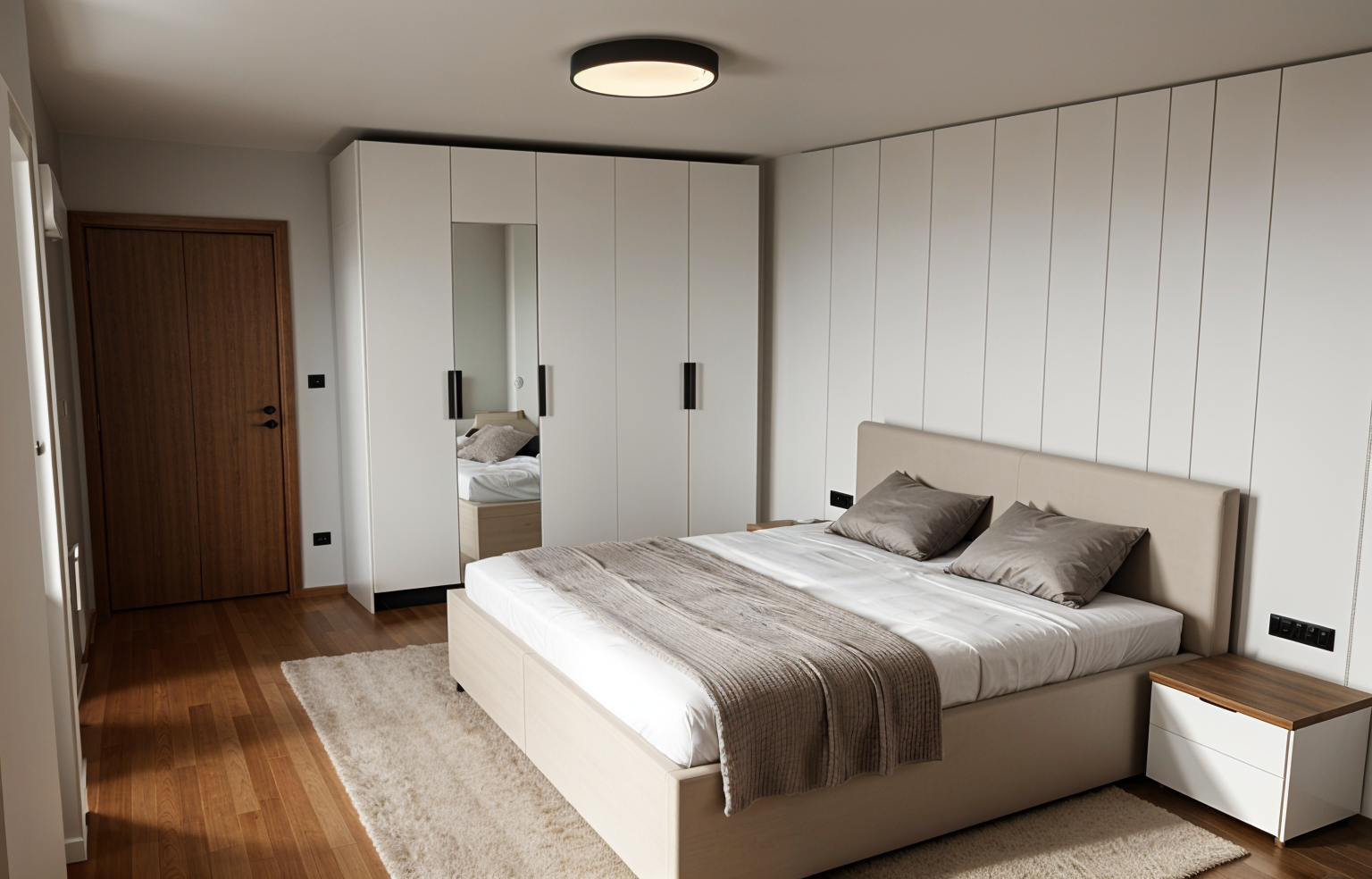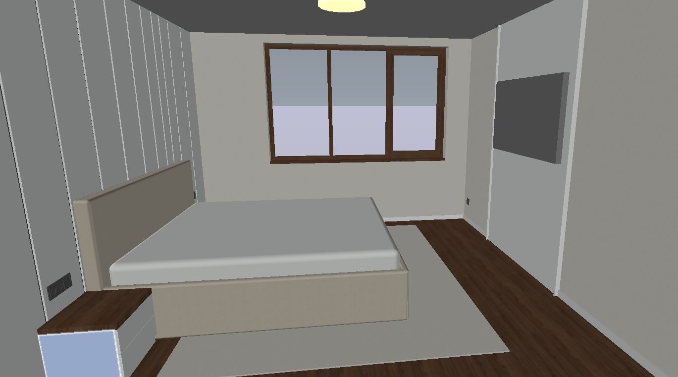 make a rendering of a modern bedroom in neutral colors a bed with pillows and duvets behind the bed there should be white smooth paneling with black vertical lines in the tv area there should be smooth white paneling beige curtains from ceiling to floor