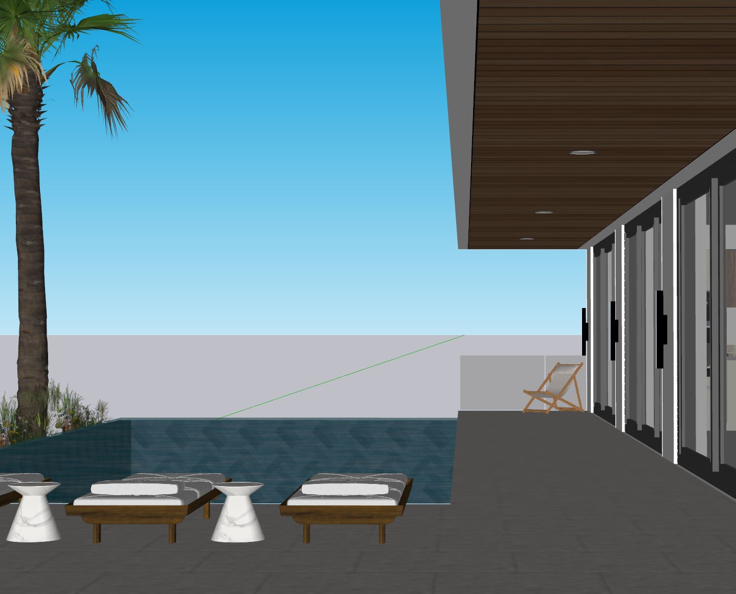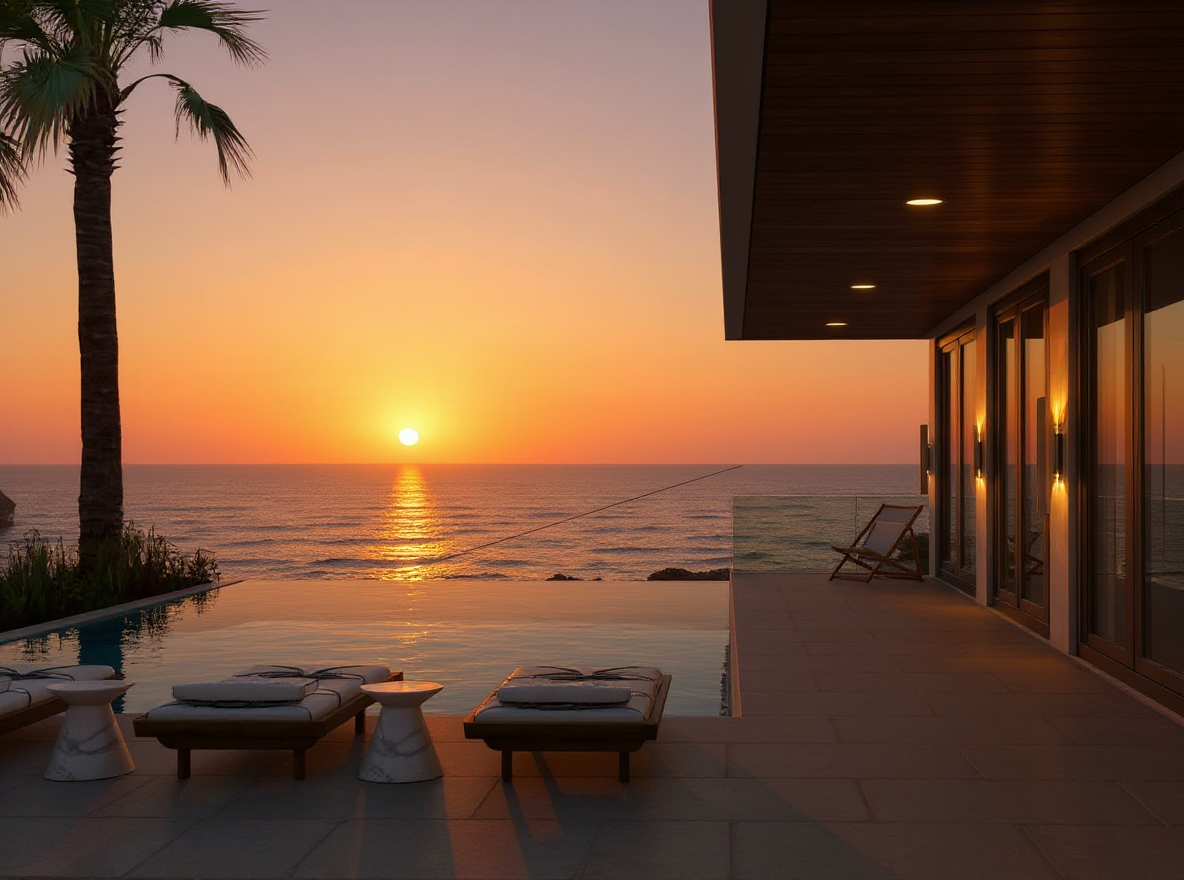 create a hyper realistic render of a modern luxury house built on the edge of a cliff featuring an infinity pool that blends seamlessly into the distant ocean horizon match the exact camera angle composition and proportions from the reference image use sunset lighting with warm golden tones long soft shadows and a cinematic glow the sun should be visible low over the ocean at the far end of the horizon casting warm reflections across the pool surface include the natural coastal vegetation on the left side growing from the cliff slope highlight the contemporary architecture with large glass sliding doors the wooden soffit with recessed lighting and the minimalist terrace layout render the pool water with realistic reflections depth and gentle ripples keep the existing sun loungers marble side tables and the wooden deck chair in the background the overall mood should feel serene elegant coastal and photorealistic capturing the warm atmosphere of a golden sunset over the ocean