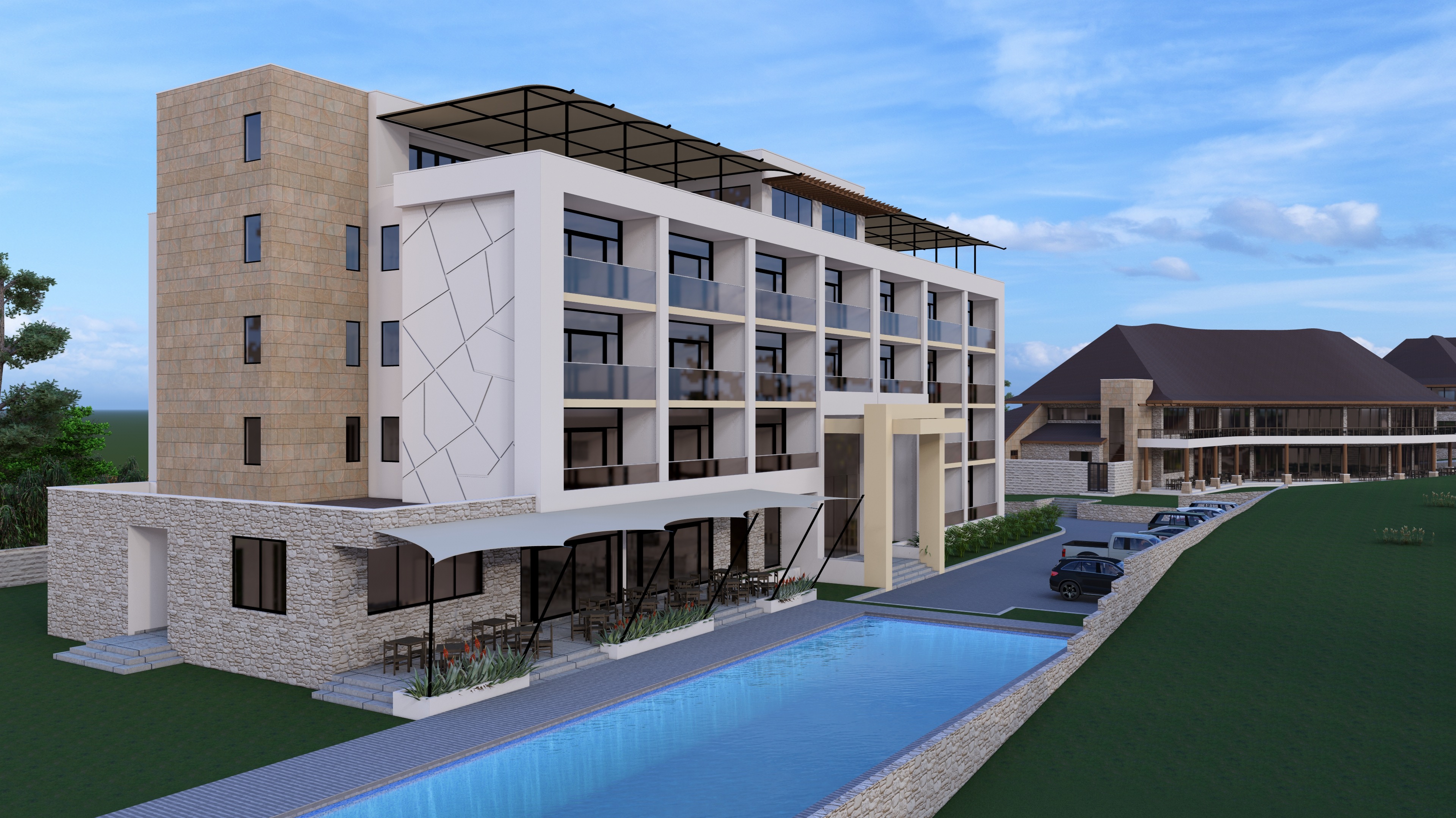 this is the front facade of a hotel make it more crisp increase lighting in the scene add very few trees in background to cover horizon add few people on balconies please maintain all colours the crisp white sections the light brown sections enhance the furniture type on partio