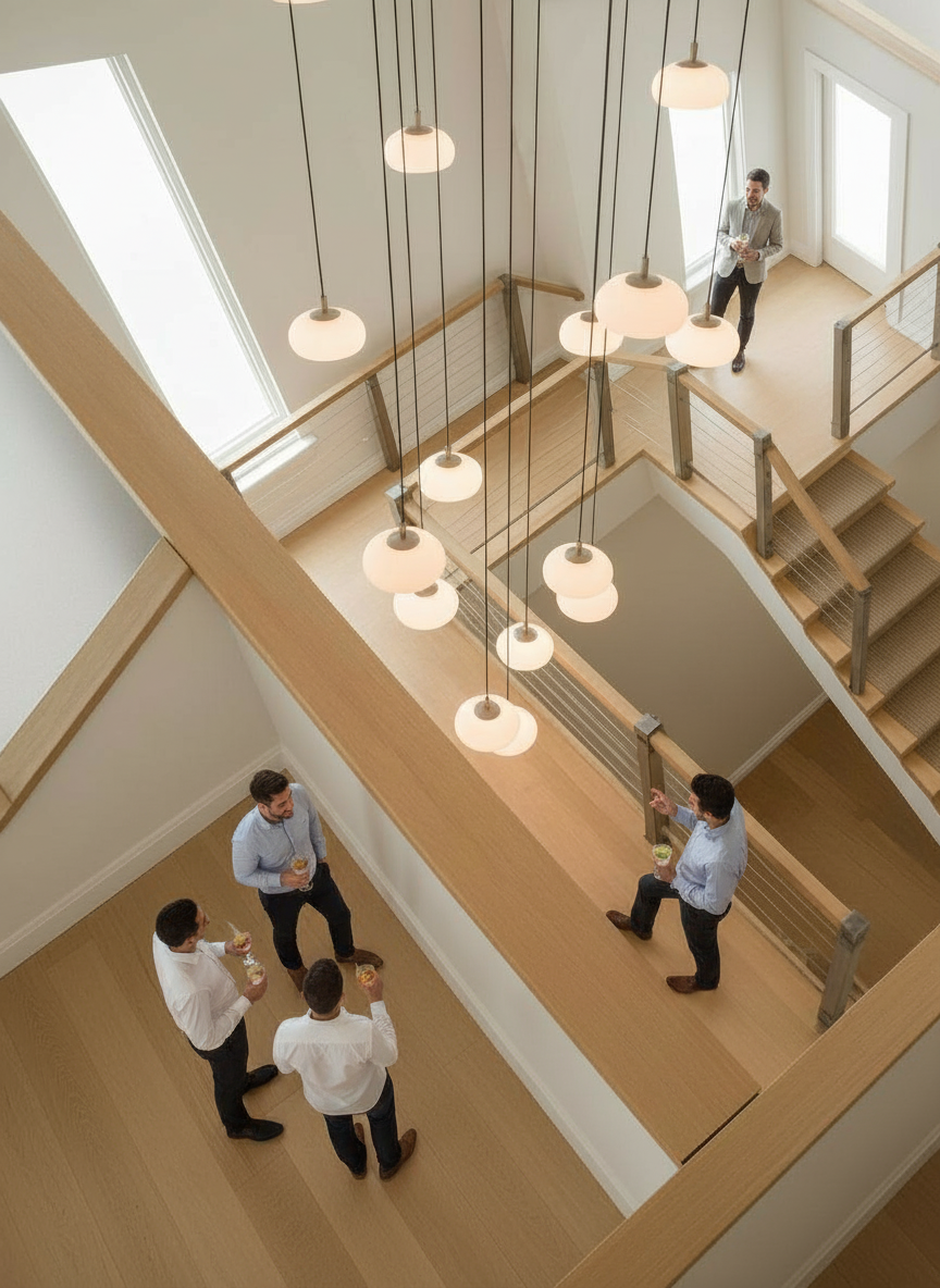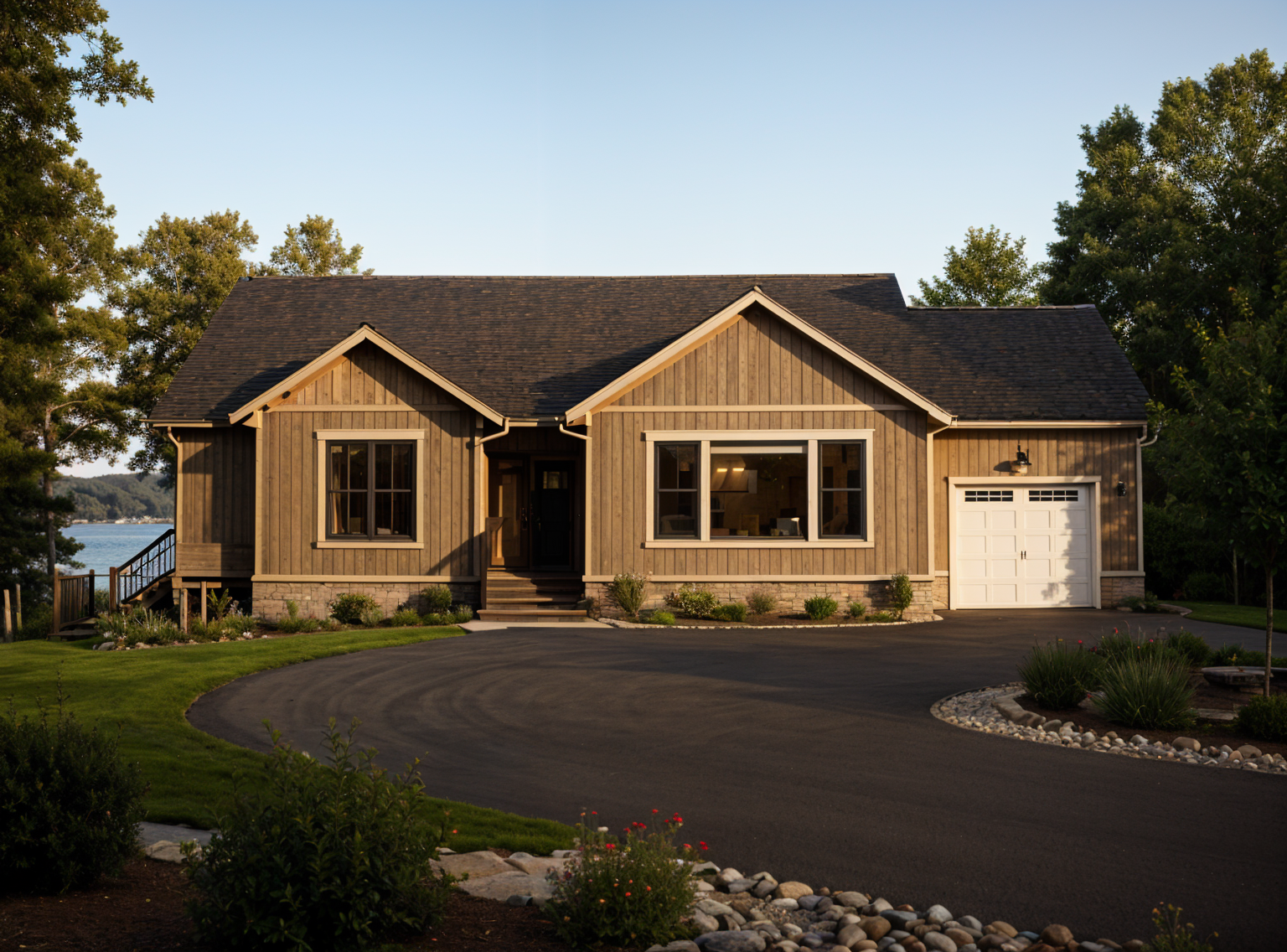 a modern ranch style structure with the following features 1 medium gray asphalt shingles 2 40 high river rock wainscot all along the front base of the house 3 the existing large window openings one located in the middle of the elevation and the other two are on the right hand side of the elevation are a pair of white single hung windows with divided light top and bottom windows 4 black shutters on the sides of each window 5 white vertical board batten siding from the top of the stone up to the roof overhang 6 the existing front door is aligned in the same plane as the front windows to the left the door panel is black and has a 9 section divided light 7 the glazing to the right side of the garage is a pair of 36 wide white arcadia patio doors with divided lights 8 there will be a 3 high river rock faux rock wall panel courtyard wall extending 16 to the right side of the garage 9 the sectional garage doors will be black with a 3 long x 6 window on the right end of each panel 10 the existing chimney will have river rock that matches the house wainscot no other options allowed stay specifically with my instructions