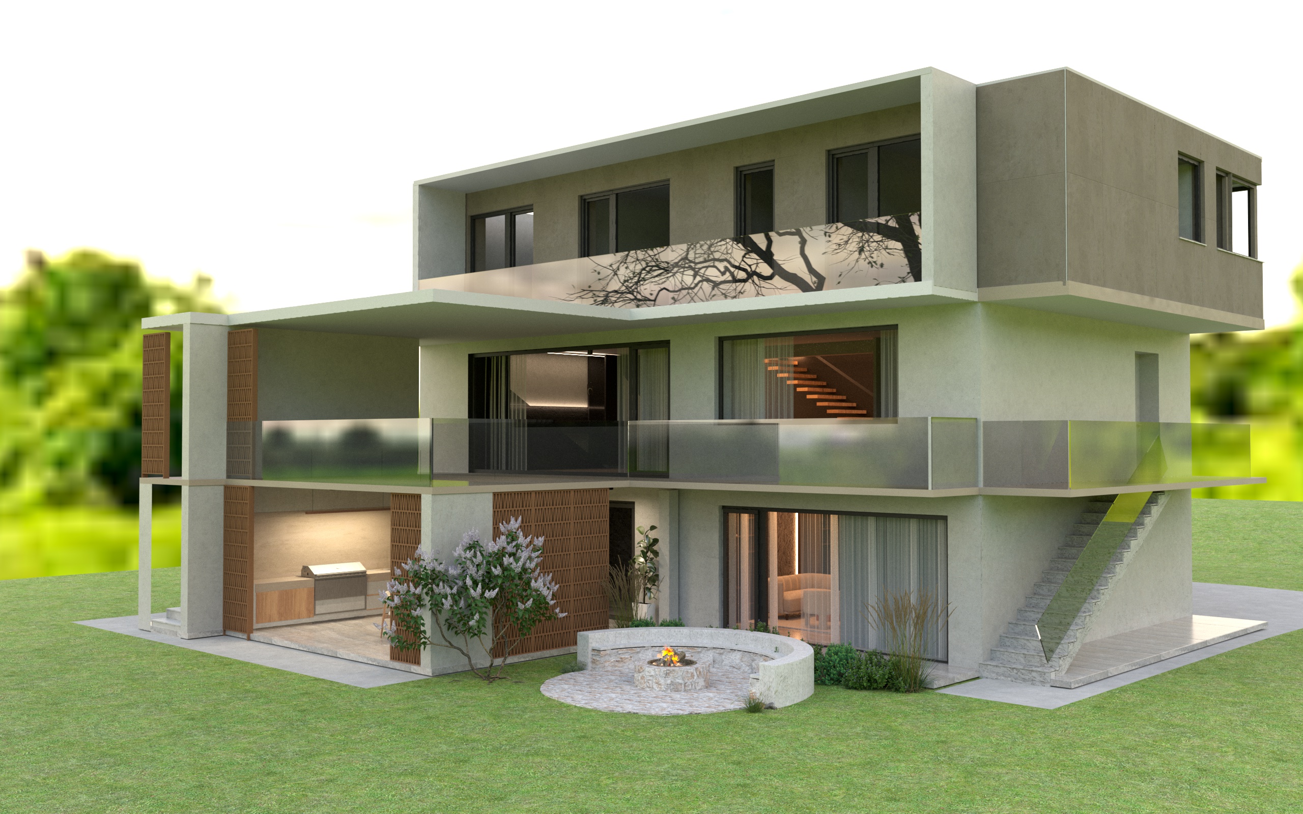 modern style three story house with genuine travertine plates on the first floor make concrete looking plates the third and second floors the element on the third floor that comes forward as a terrace needs to be in white stucco make better texture and surroundings smoked light brown glass and chrome railing dark grey window frames do not change the angle of the image add pathway around the house the stone on the firepit area must be lighter than the picture and make it a little bit further from the house than it is now make the grass textured