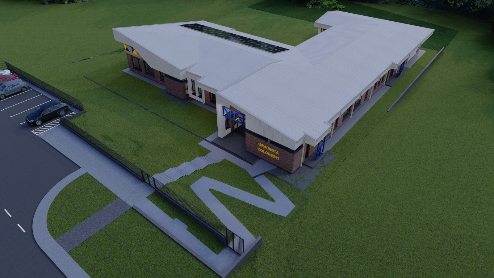 convert the image into a realistic outdoor photograph with professional architectural aesthetic maintaining 100 of the geometry and layout applying authentic materials summer daylight lighting with soft shadows and a sharp photorealistic result add a kindergarden playground in front of the building and some shrubs in the foreground