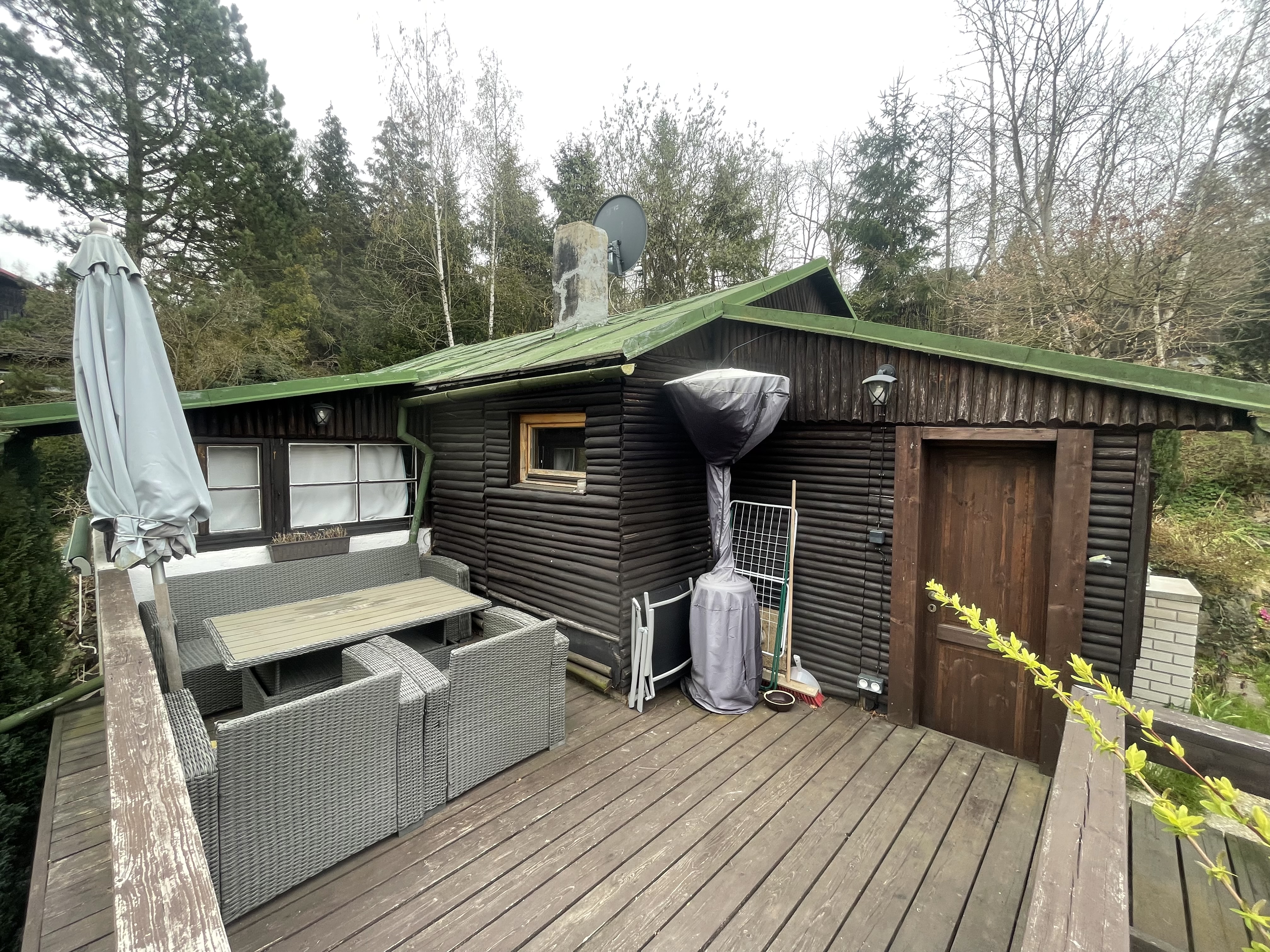 country house with wooden blue grey facade with dark grey windows and dark grey door dark grey roof