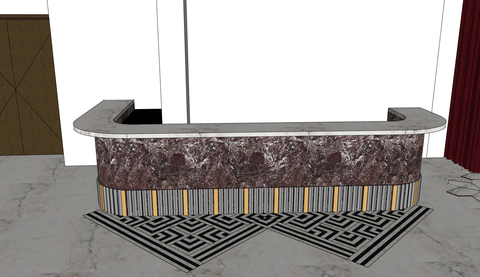 interior shot create a 3d model representing a backdrop for a bar designed to showcase drinks the design should blend a modern style with subtle classic accents inspired by elegance and refinement the key concept is ruby with the dominant colors being rich and vibrant ruby tones complemented by metallic accents gold or copper for a luxurious look the materials should exude opulence such as glossy glass marble or lacquered finishes paired with high quality textile or metallic elements include discreetly illuminated shelves to highlight the drinks and enhance the texture of the materials the design should convey sophistication and stand out in any space