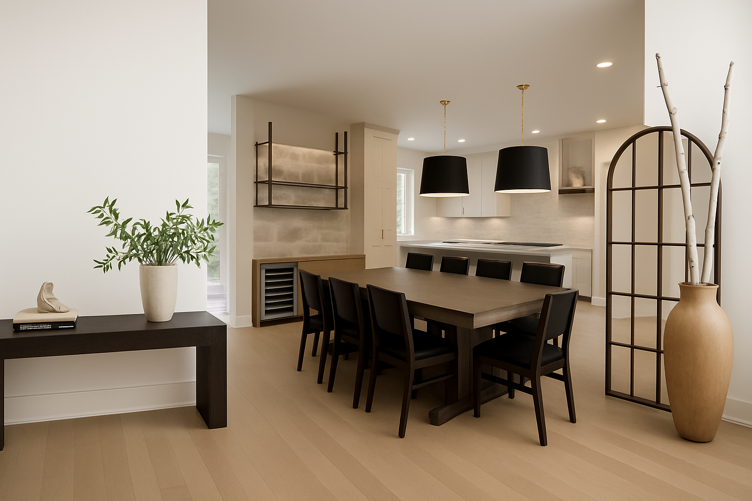 add a few trees in the background of the scene also add some bushes and flowers the roofs of the house are covered in grass