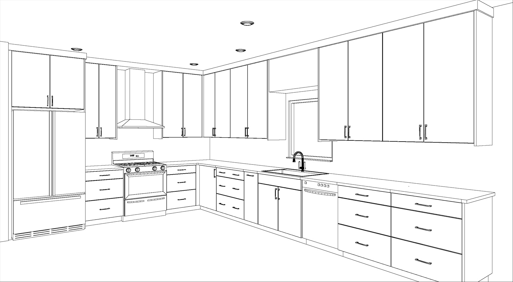 render a modern kitchen with a serene and inviting atmosphere use a soft light white color for the upper cabinets and fridge cabinets with sleek matte black handles the lower cabinet s are a dark grey matte finish the sink is a black undermount sink the countertops should be a polished concrete set stainless steel appliances including a refrigerator dishwasher and stove to complement the sophisticated look add a black matte faucet over a deep white sink use recessed lighting in brushed steel finish to give the kitchen a warm glow the flooring should be polished concrete with expansion joints adding a touch of natural warmth the wall behind the sink should have a light subway tile backsplash in crisp white enhancing the clean aesthetic