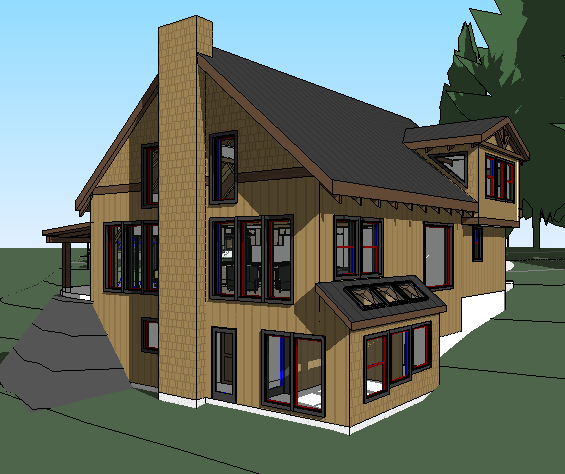 add natural lighting make look realistic add landscaping and a forest background there should be an ocean view reflection in the windows this is the back of the house