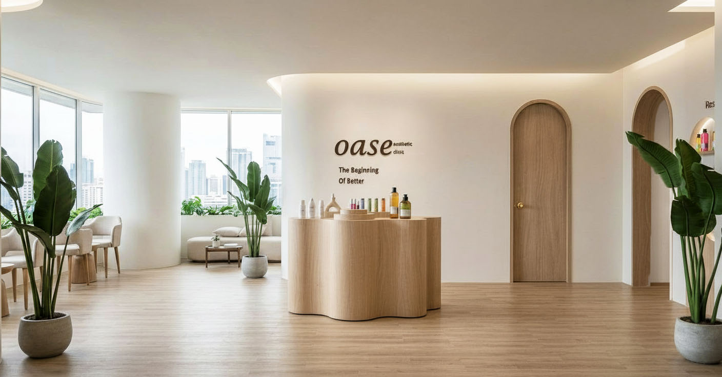 hapus tulisan oase clinic yang ada di dinding jadi dinding polos aja kongliong yang sebalah kanan jadi putih polos aja tanpa warna kayu tanpa merubah bentuk dan material yang lain
