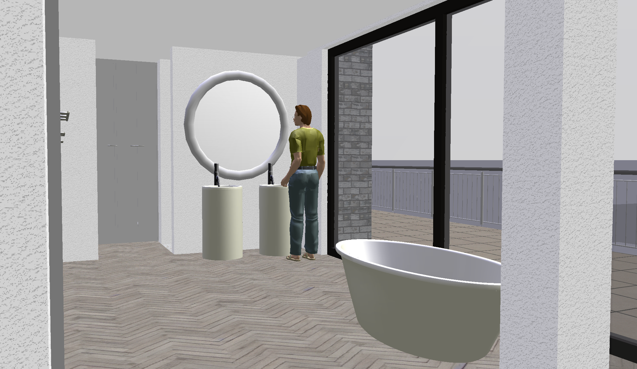 genau dieses rendering berarbeiten fotorealistisches innenraum foto exakt dieselbe perspektive und kameraposition wie das hochgeladene referenzbild 100 identische raumgeometrie exakt gleiche m belanordnung exakt gleiche verlegeart und richtung von parket wie vorlage exakt identische fensterpositionen mit gleichem ausblick durch die fenster weiches nat rliches tageslicht leicht schr g einfallende sonne durch die grossen fenster geschlossene r ume k nstlich ausleuchten sanfte realistische schatten blickrichtung ist nach osten sonnenlicht kommt von s den realistische materialien echte holztexturen stoff mit leichten gebrauchsspuren hochwertige oberfl chenreflexionen kleine gr npflanzen am boden lavabo aus marmor collemandina grigio in braungrau dunkel dahinter je eine vola standarmatur fs2 edelstahl links hinten bei den lavabos hat es einen schrank f r badet cher schrankfronten alle grauglas gl nzend ohne griffe parket ruhig und hellgrau vollkommen rahmenloser und hinterleuchteter spiegel 140 cm durchmesser hinter den lavabos ist die nicht sichtbare dusche hell ausgeleuchtet badewanne aus milchglas dunkelgrau transluzent dahinter eine standarmatur vola fs1 alle sichtbaren w nde sind sichtbeton leichter tagesvorhang in graubeige auf der rechten seite des fensters runde filigrane schwarze einbauspots vor der fensterfront sehr moderner minimalistischer look menschen mit echten menschen im freizeitlook ersetzen nat rliche farbwiedergabe golden hour feeling das bild muss wie eine professionelle fotografie aussehen es soll ein echtes und reales foto sein canon eos r5 35 mm festbrennweite f 2 8 hyperrealistisch dslr qualit t raw aufnahme 8k aufl sung extrem scharf perfekte tiefensch rfe professionelle architekturfotografie
